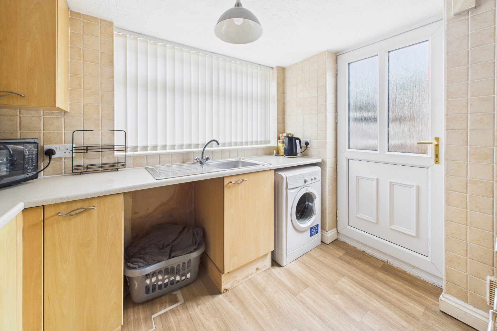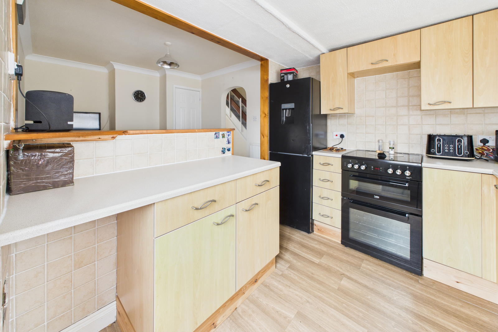 UPVC double-glazed window to the front aspect, eye-level and base units, stainless steel sink with drainer and chrome mixer tap, wood-effect flooring, power points, storage cupboard, radiator, space for washing machine and fridge freezer, electric hob with oven and cooker, and fuse box.