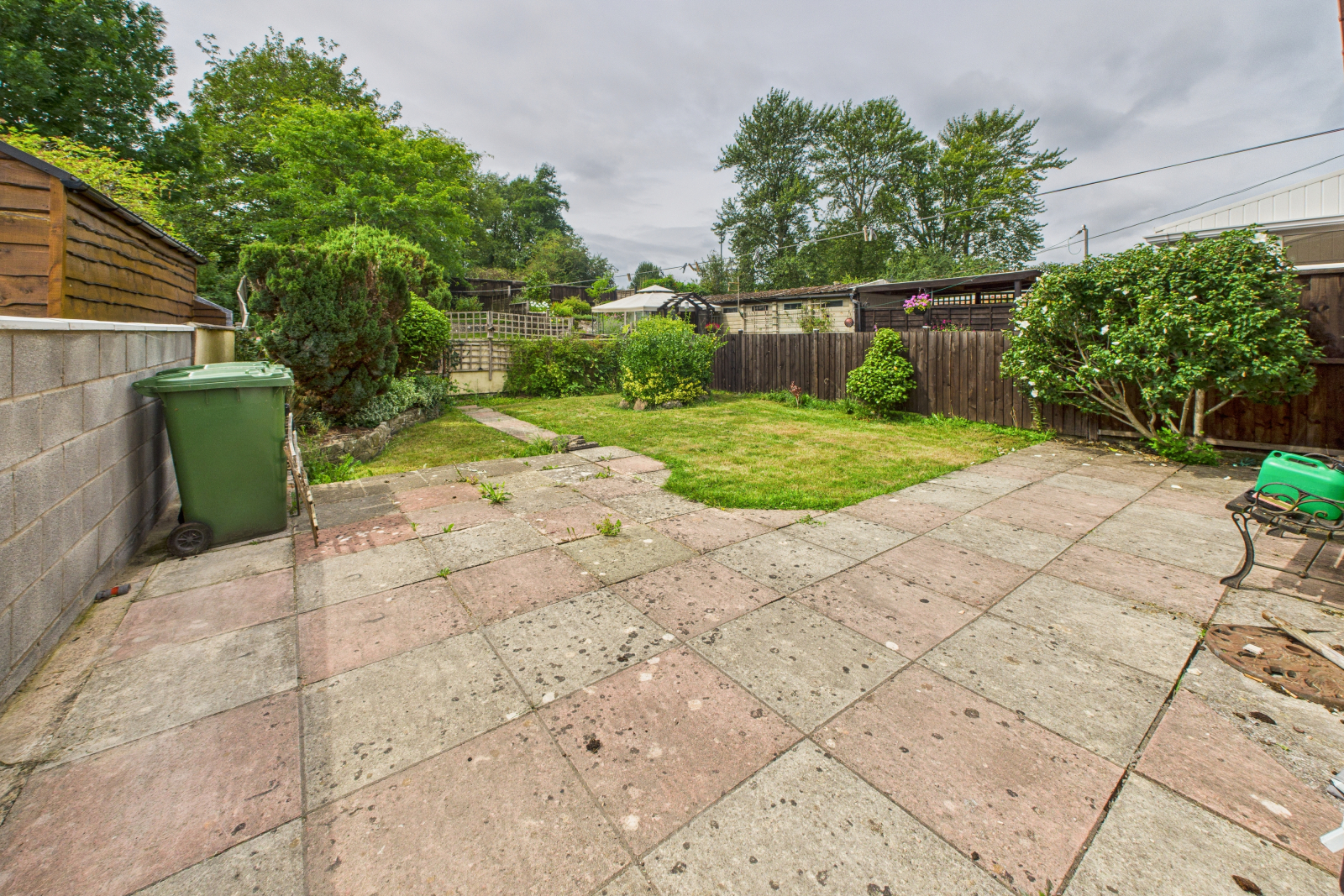 Generously sized garden, laid partly to patio and partly to lawn, with a selection of mixed shrubbery.
