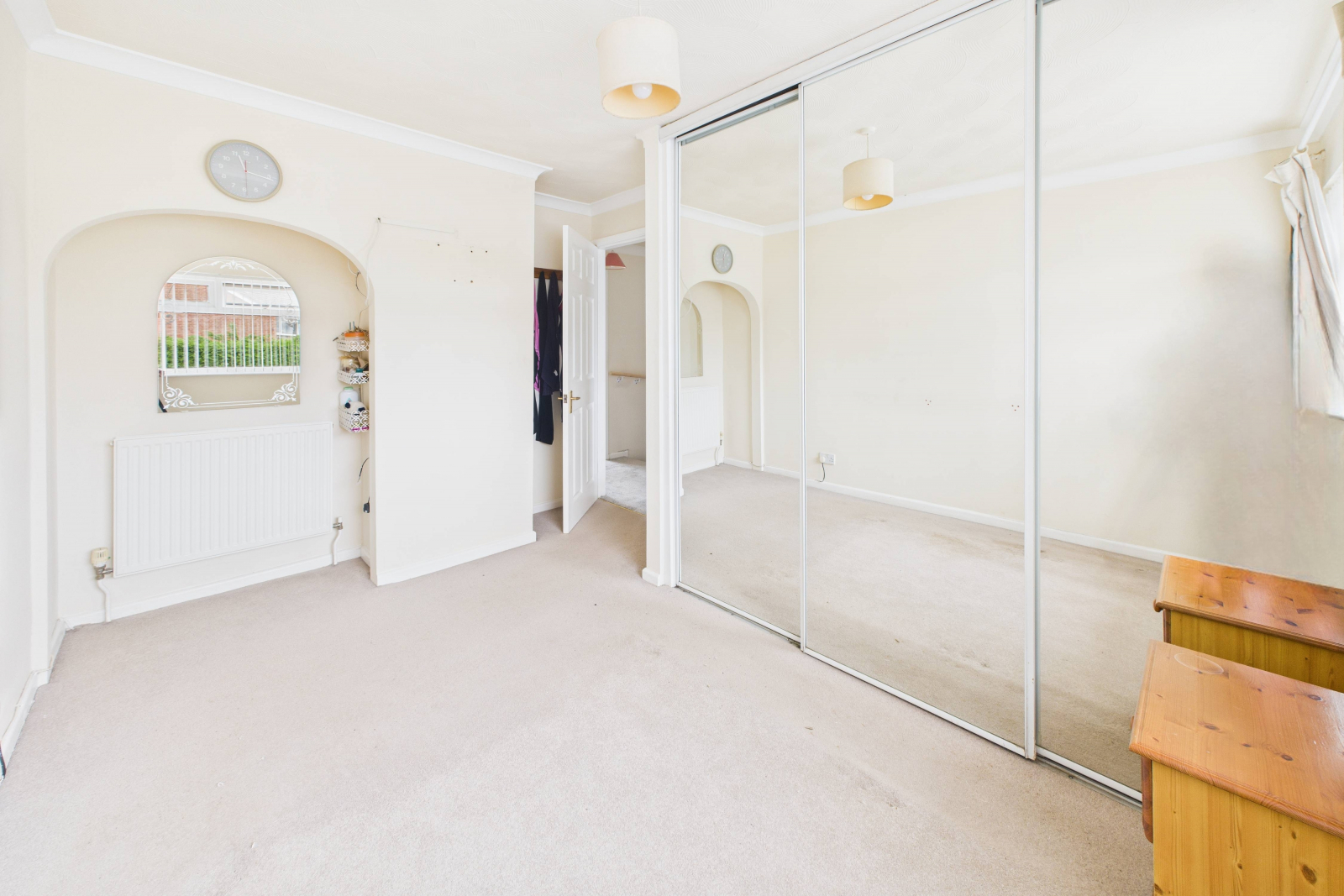 Beige carpet flooring, UPVC double-glazed window to the front aspect, power points, radiator, and built-in wardrobe with sliding doors.