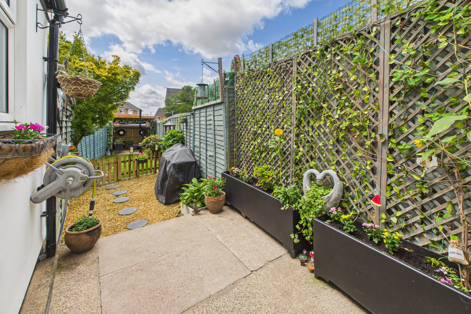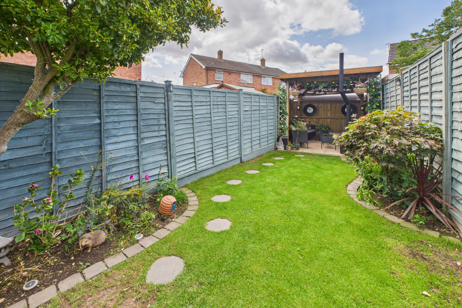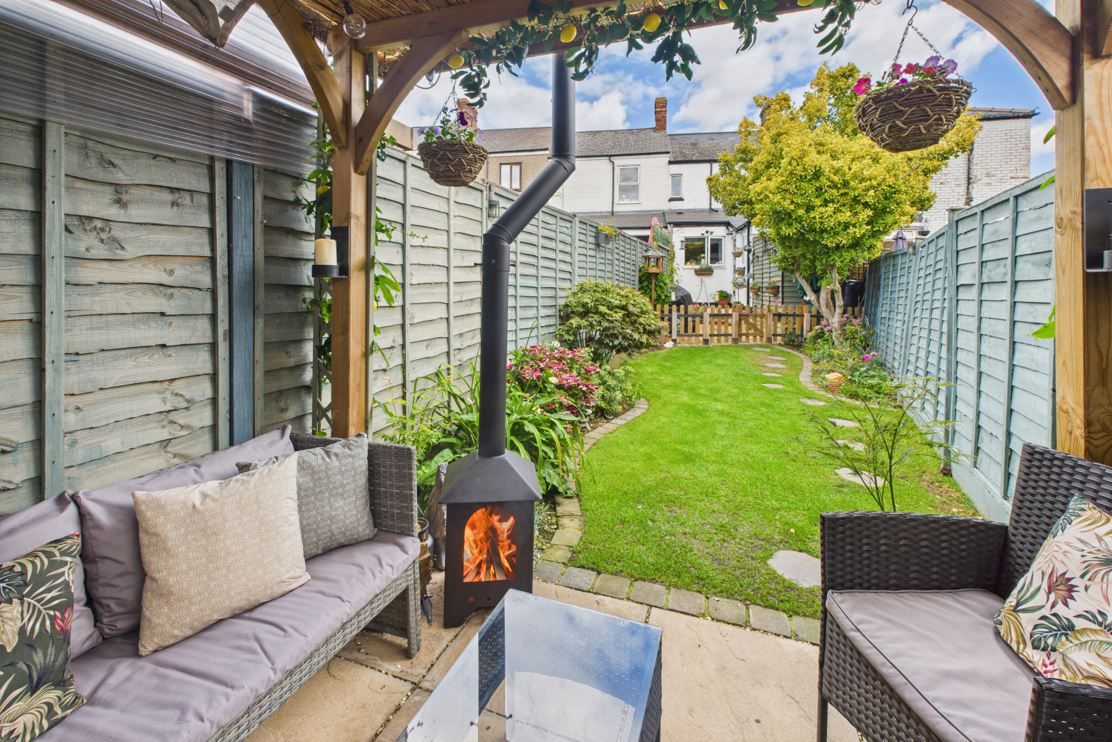 This rear garden has been lovingly landscaped and cared for. Concrete terrace level with outside water tap and bespoke steel planters, steps down to gravelled area with decorative stepping stones and custom-built storage shed. A small picket-style fence leads to the lawned area of the garden with stone-bordered flower beds. At the rear of the garden, a timber pergola creates a sheltered seating area, beautifully dressed with planting, lighting, and a wood burner, making it ideal for relaxing or entertaining.