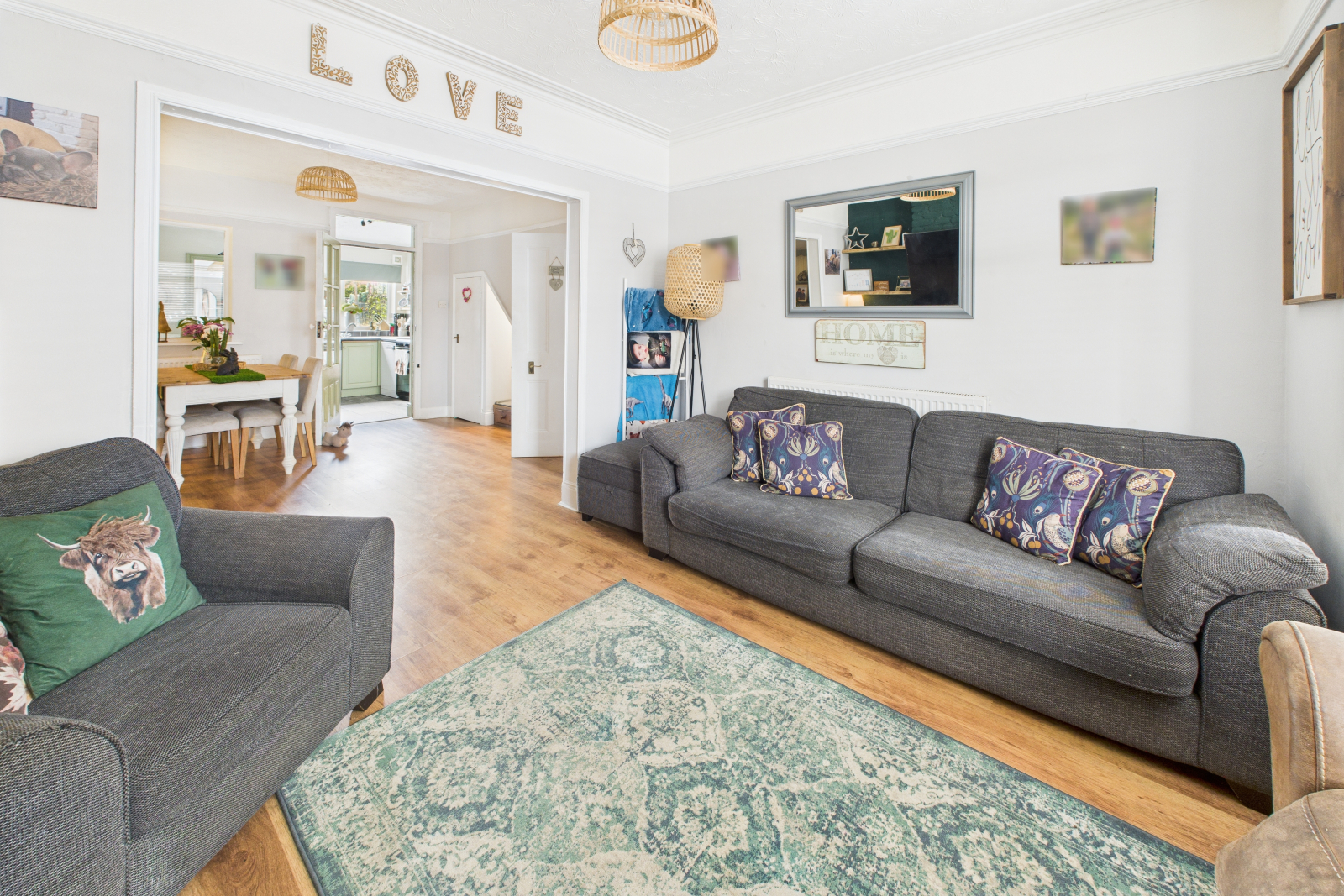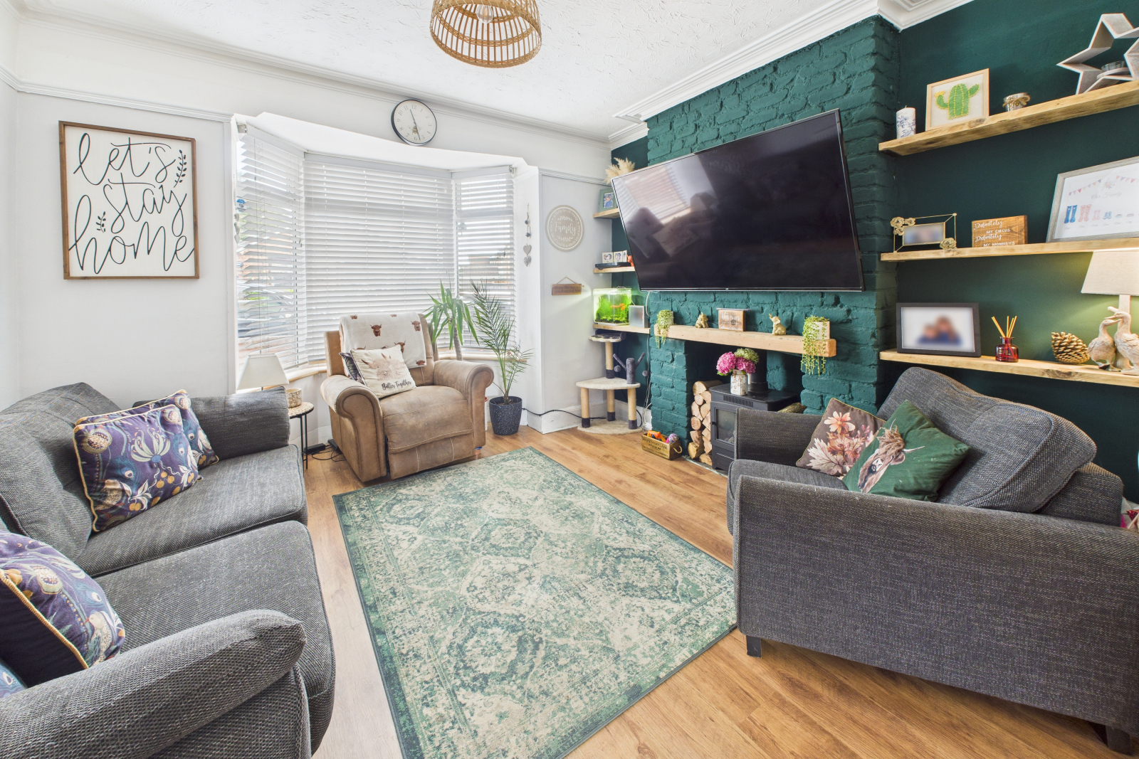UPVC double glazed window to front aspect. A delightful bay window floods the room with light, with custom shutter blinds, wooden effect flooring, and wall mounted radiator. The stone fireplace houses a gas, coal effect fire with bespoke wooden mantel and tiled hearth. To each side sits bespoke wooden shelving. The room is finished off with decorative high picture rail and coving. The room has been opened up and flows seamlessly into the: