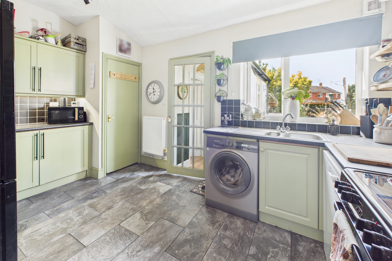UPVC double glazed window to rear aspect overlooking garden. Stone effect tile flooring with a range of base and eye-level units. Roll top worktop with chrome effect sink and drainer and mixer tap over. Tiled splash back. Space for washing machine, dryer, dishwasher and freestanding oven. Chrome effect extractor fan, wall mounted radiator and storage space. Wooden internal door with glass panels leads to: