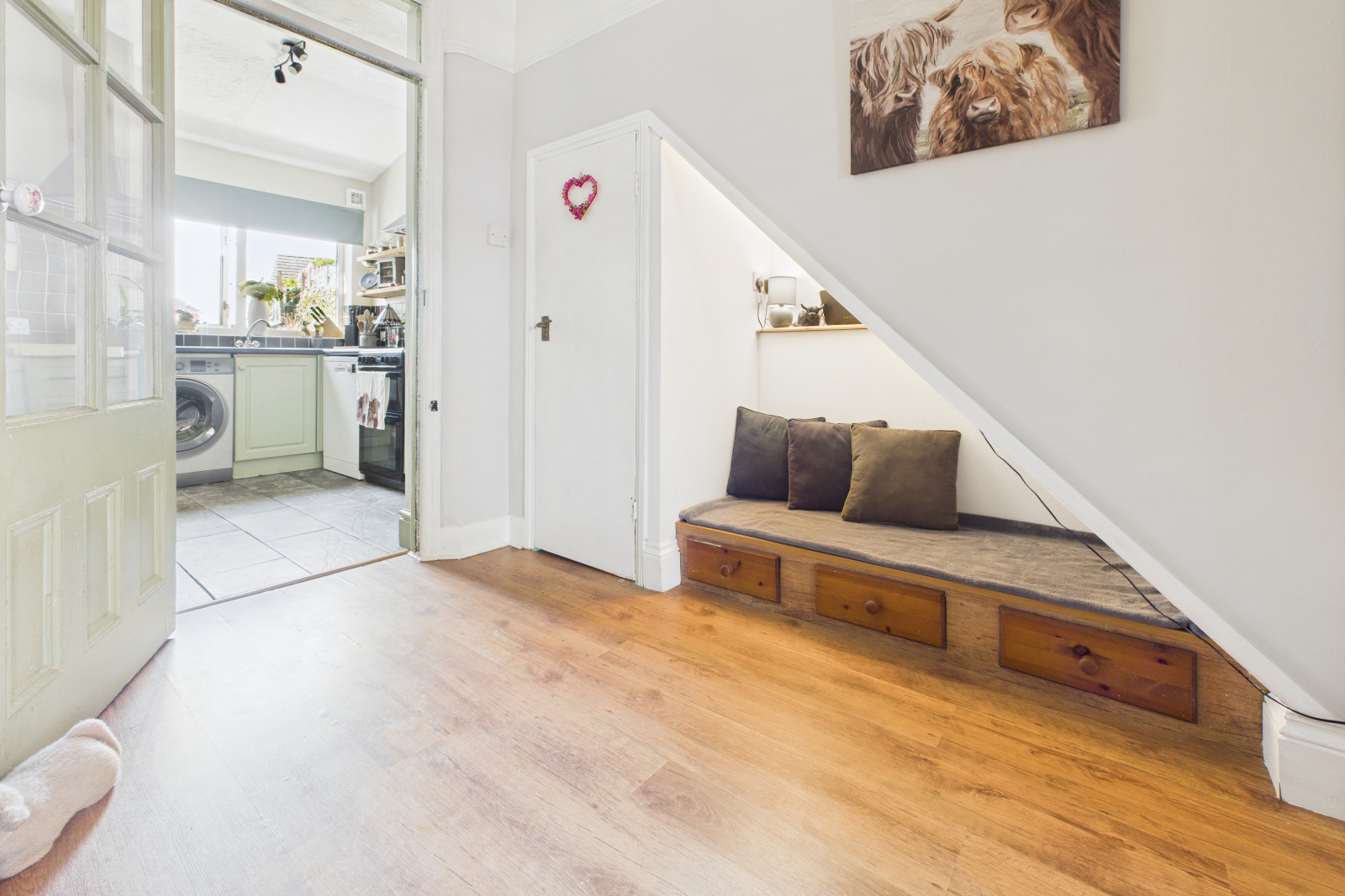 Continued through wooden effect flooring, wall mounted radiator, and second feature stone fireplace with raised tile hearth and steel edging. Decorative high picture rail. The under-stairs area not only has useful storage space but also a bespoke snug area with raised platform and wooden drawers. Internal wooden frame window, and wooden glass panel door leads you into: