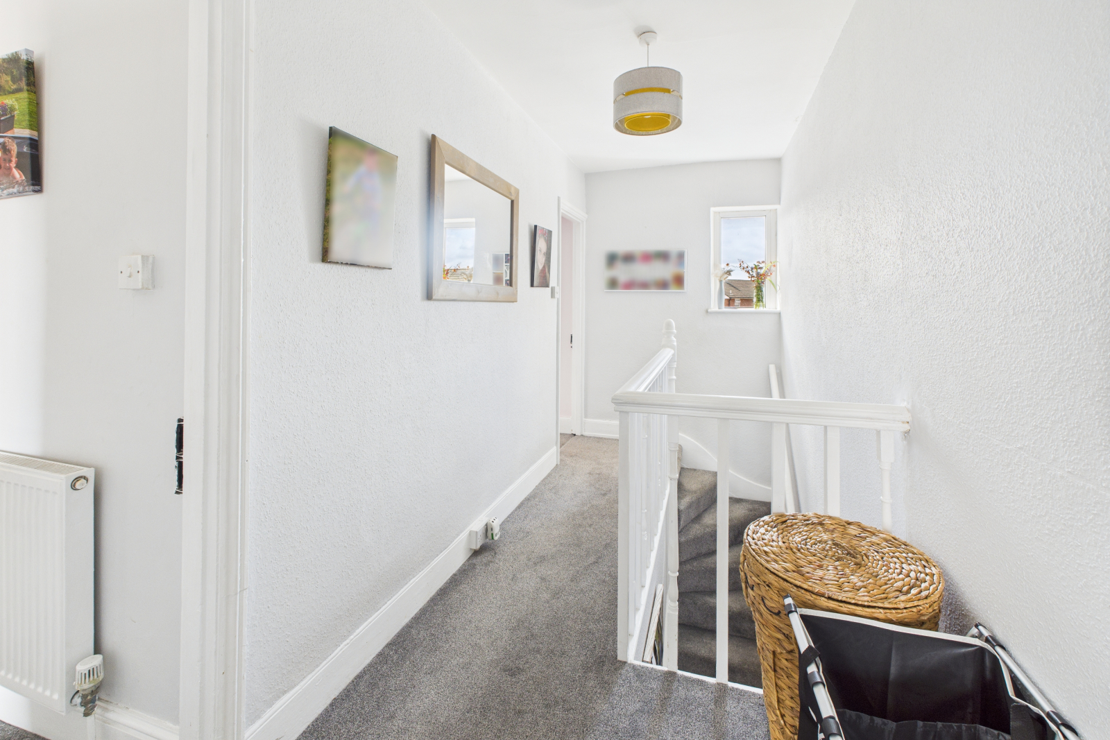 Spacious landing with small UPVC double glazed window to rear aspect, carpeted flooring, wooden banister, central pendant lighting and doors leading off to: