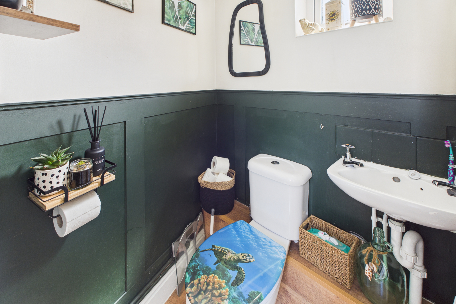 Continued wood effect flooring, and custom panelling. Two-piece white suite comprising low-level push-button W.C and hand wash basin. Obscured double glazed UPVC window to side aspect. Wall mounted radiator.