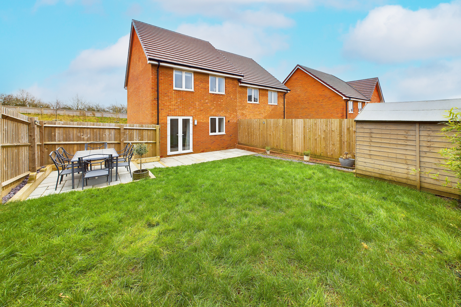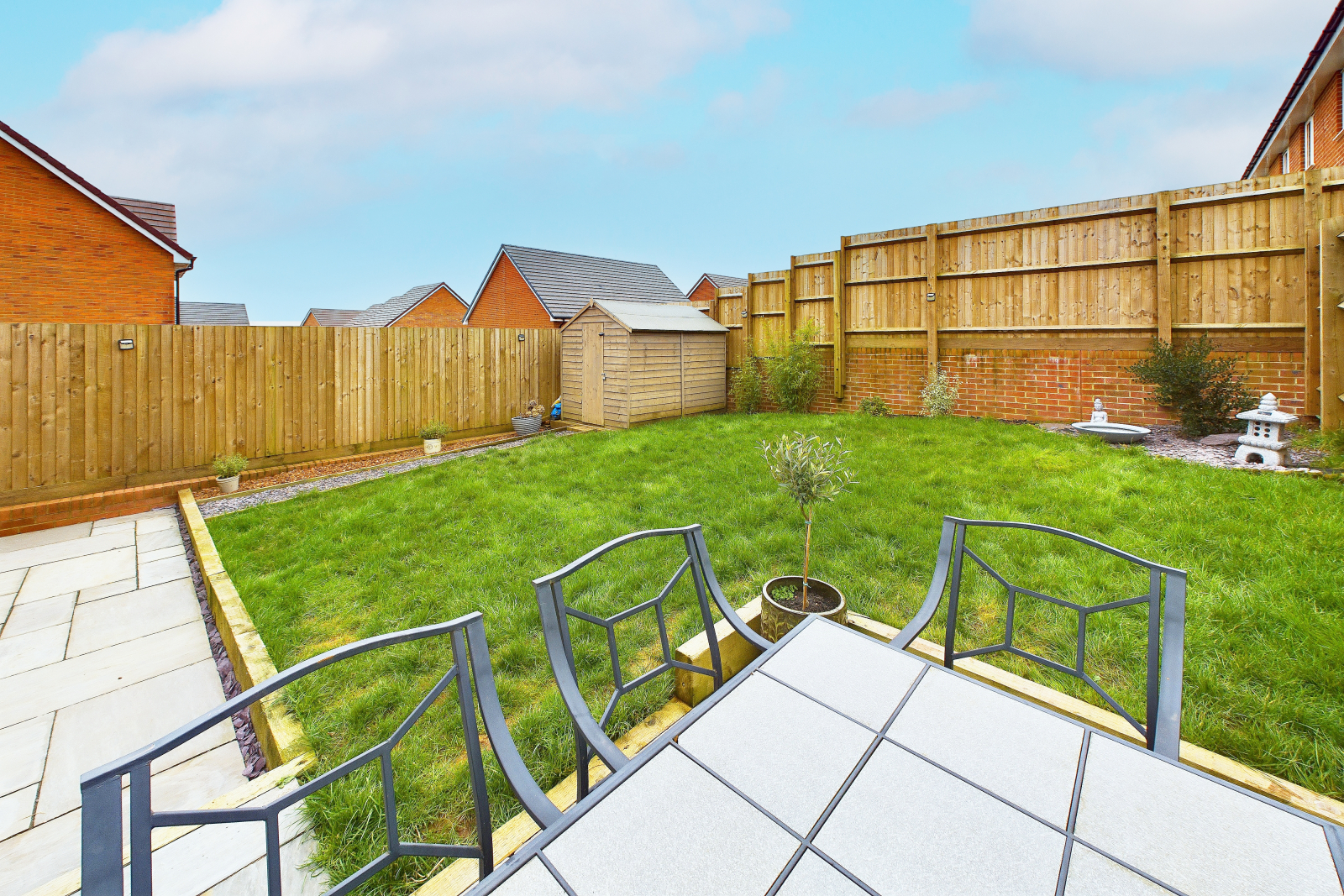 Set within a generously sized plot, the rear garden has been thoughtfully landscaped by the current owners. A spacious paved patio offers the perfect setting for outdoor dining and entertaining, while a large lawn provides an open and versatile space. Secure fenced and walled boundaries create a private retreat, with a slate pathway leading to a wooden garden shed. Feature barked borders, dotted with low-maintenance shrubs, add to the garden’s charm. A raised patio terrace offers an additional sun-soaked seating area, ideal for enjoying warm summer evenings.