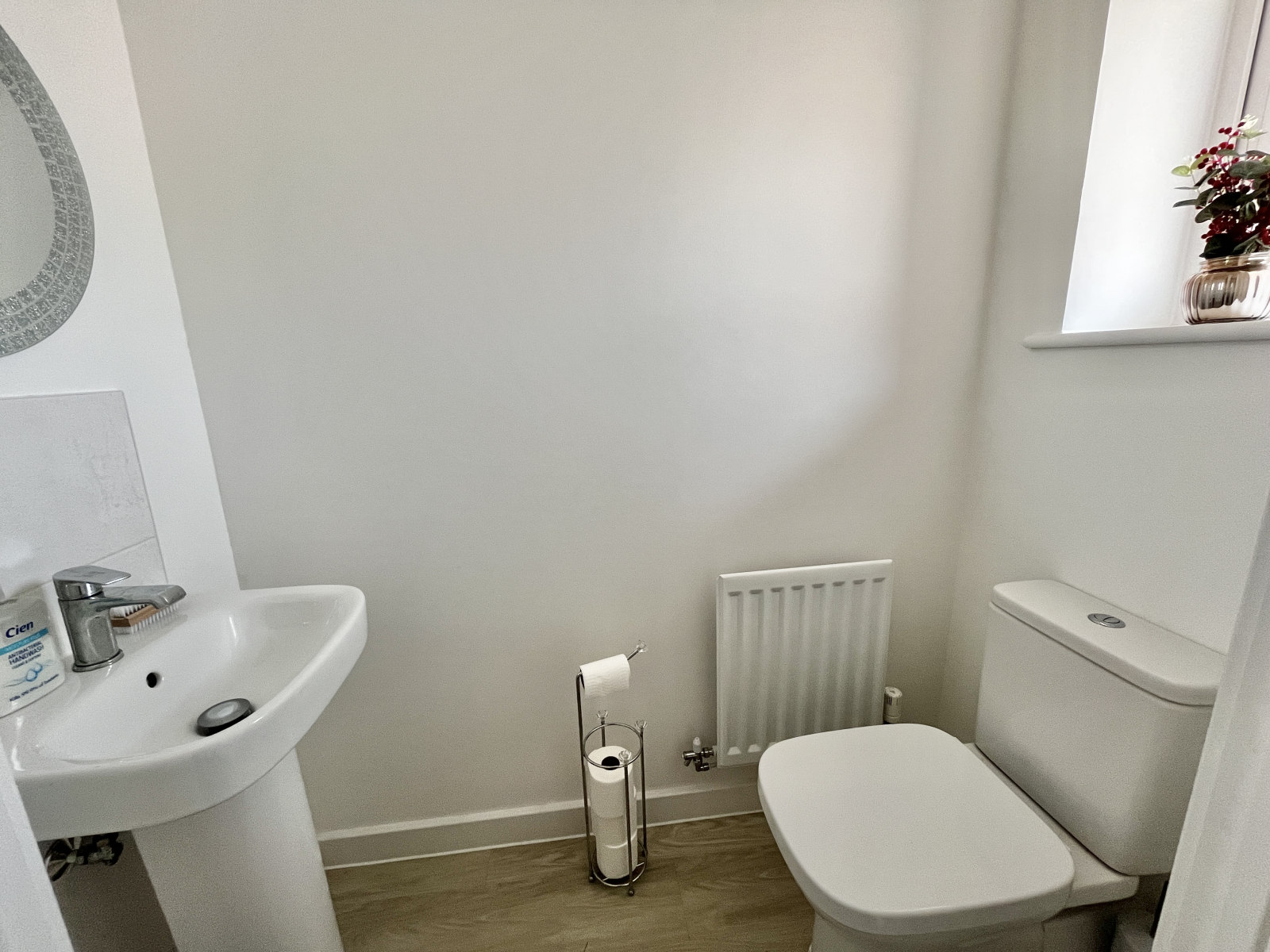 Downstairs Cloakroom 1.70m x 0.84m (5'07 x 2'09) Obscured UPVC double-glazed window to front elevation. Low level push button W.C and pedestal wash hand basin with tiled splash back and mixer tap. Karndean wood effect flooring, Central lighting and radiator.