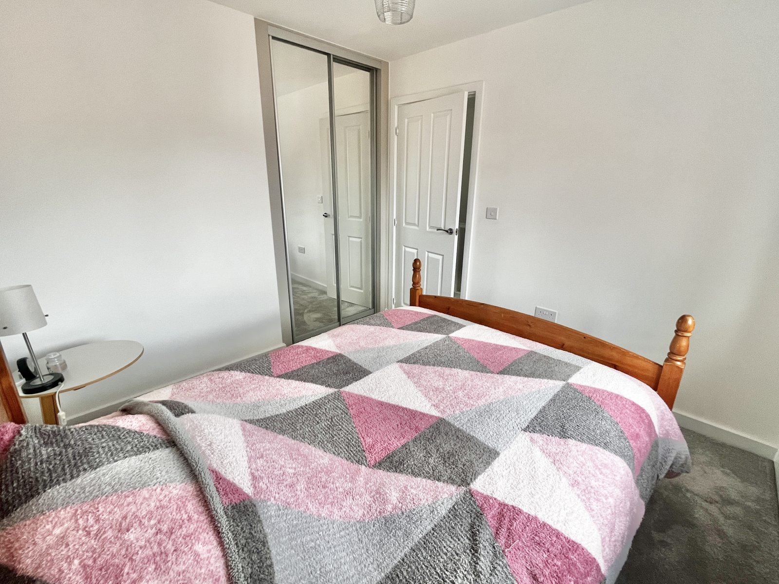 Bedroom Two 2.82m x 2.72m (9'03 x 8'11) UPVC double-glazed window to front elevation with radiator under. Upgraded carpeted flooring and central lighting. Range of power points. Mirrored fitted double wardrobe with ample hanging rails and shelving space.
