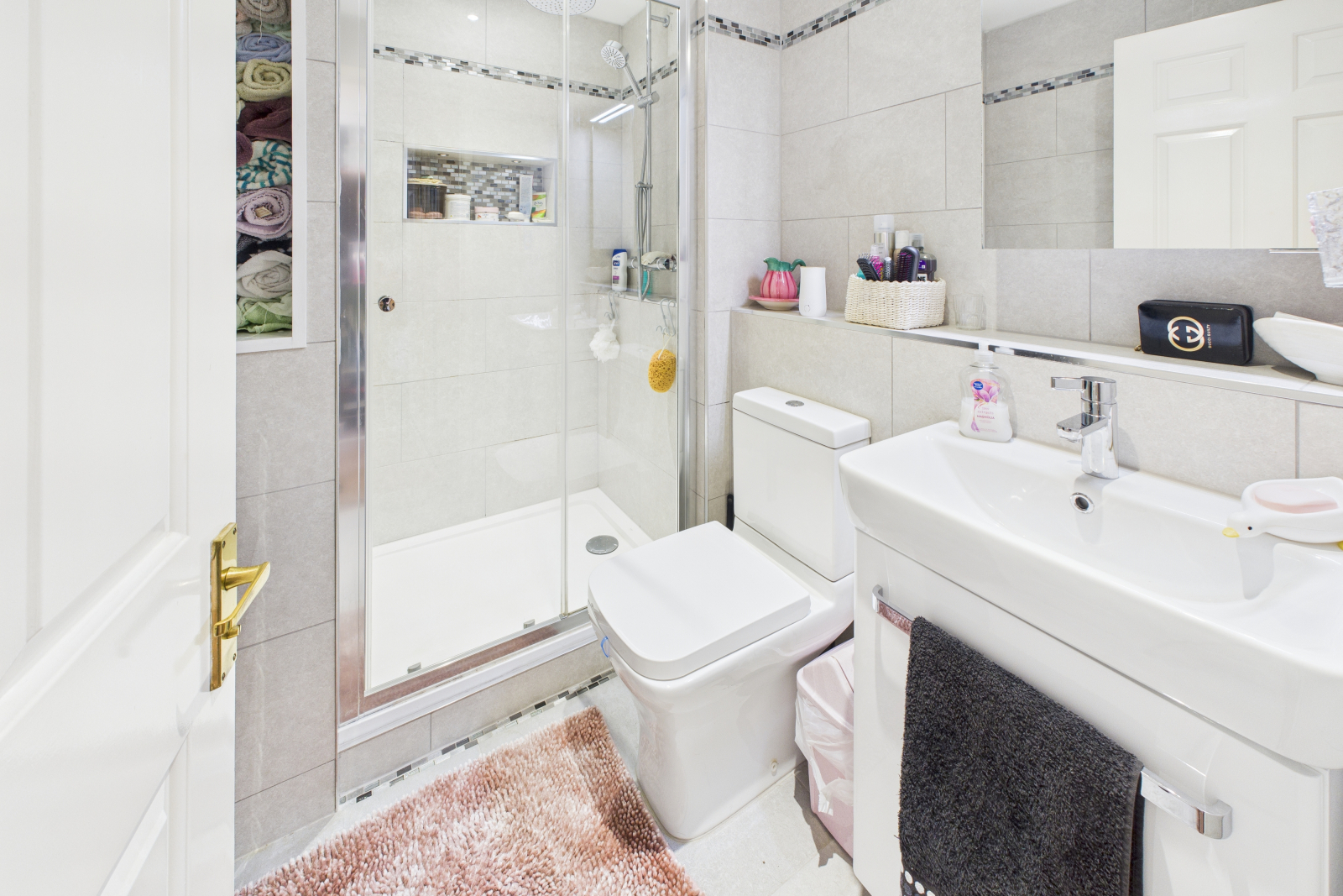Beautifully modernised by the current owner to create a spa-like feel. White suite comprising wash hand basin with vanity unit and mixer tap, low-level push-button WC, and a step-in double shower cubicle with power shower, rainfall shower head, and additional attachments. Feature tiled alcove with spot lighting. Fully tiled throughout with spot lighting, chrome-effect heated towel rail, extractor fan, and mirrored wall-mounted vanity unit with integrated lighting.