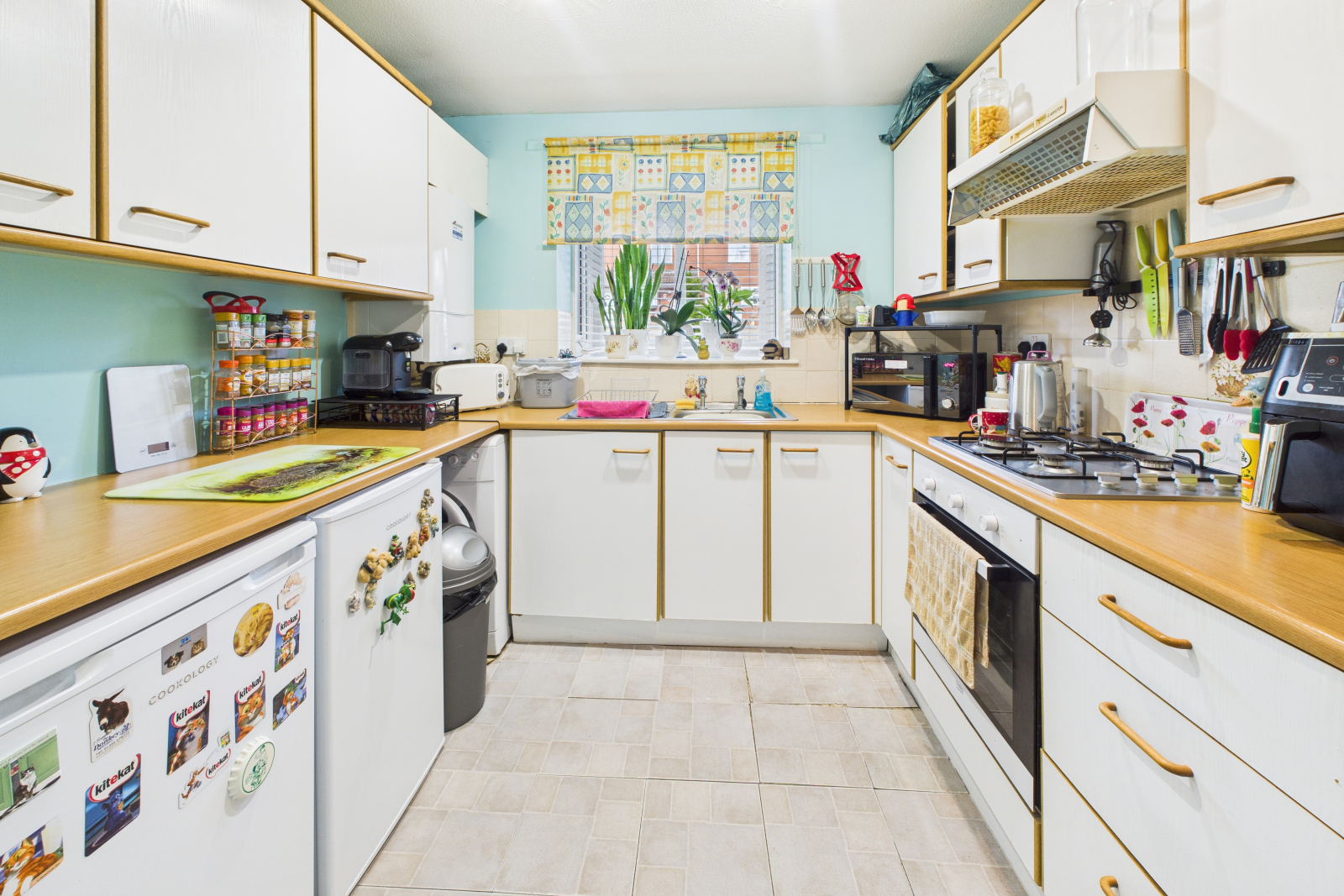 UPVC double-glazed bay window to the front aspect. An excellent range of base and eye-level fitted units and drawers with wood-effect work surfaces and tiled splashbacks. Integrated gas hob with extractor hood above, electric oven, and stainless-steel sink with drainer. Ample space for under-counter appliances and a wall-mounted Worcester gas central heating boiler. Finished with spot lighting, radiator, tile-effect flooring, and shelving.