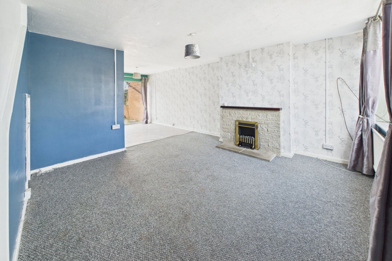 Generous reception space with large UPVC double-glazed window to front aspect and radiator beneath. Stone fireplace with slabbed hearth and wooden mantle housing electric fire. Carpeted flooring, under-stairs storage, smoke alarm, central pendant light. Open-plan access to dining area.