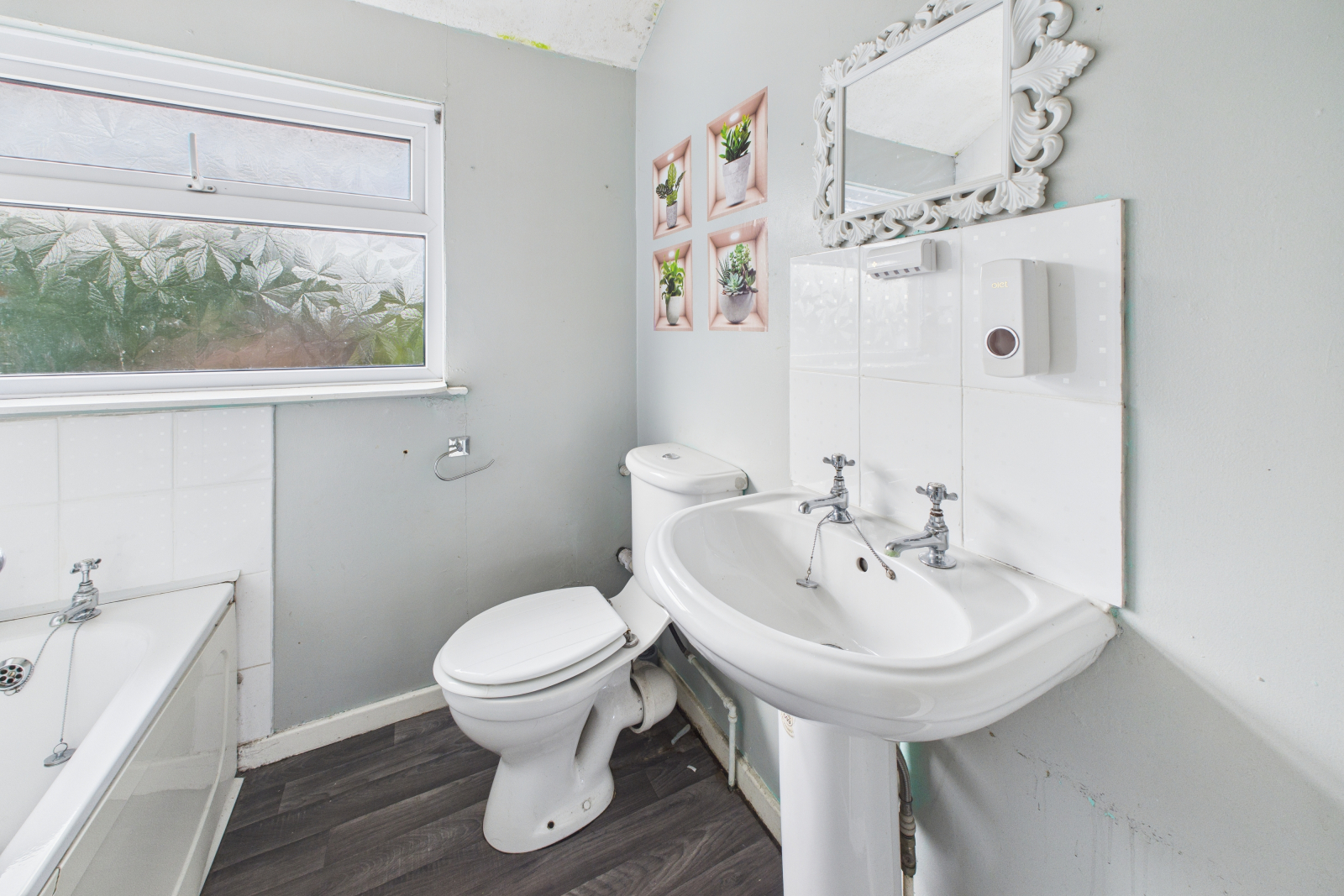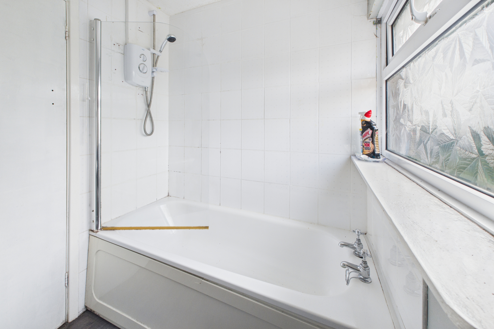 Obscured UPVC double-glazed window to rear aspect. Fitted with a three-piece white suite comprising bath with power shower over, low-level WC, and wash hand basin with tiled splashbacks. Wood-effect vinyl flooring and radiator.