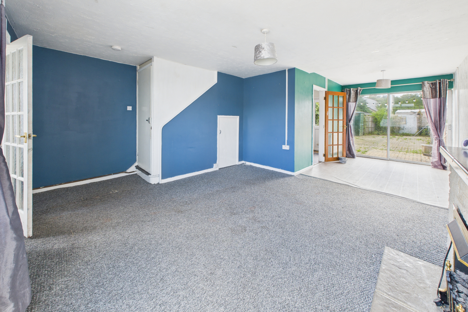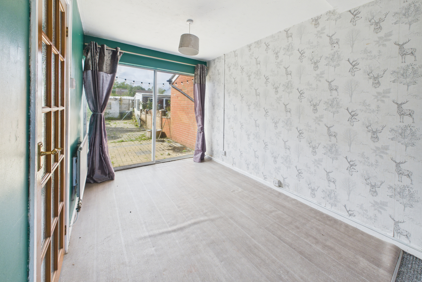 Double-glazed aluminium patio doors opening onto the rear garden. Wood-effect vinyl flooring, radiator, power points, and ceiling light.