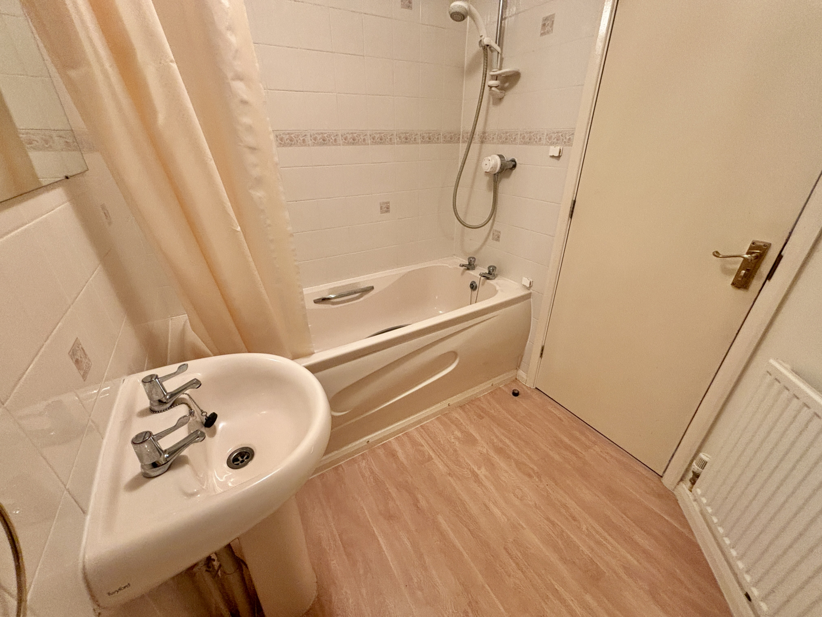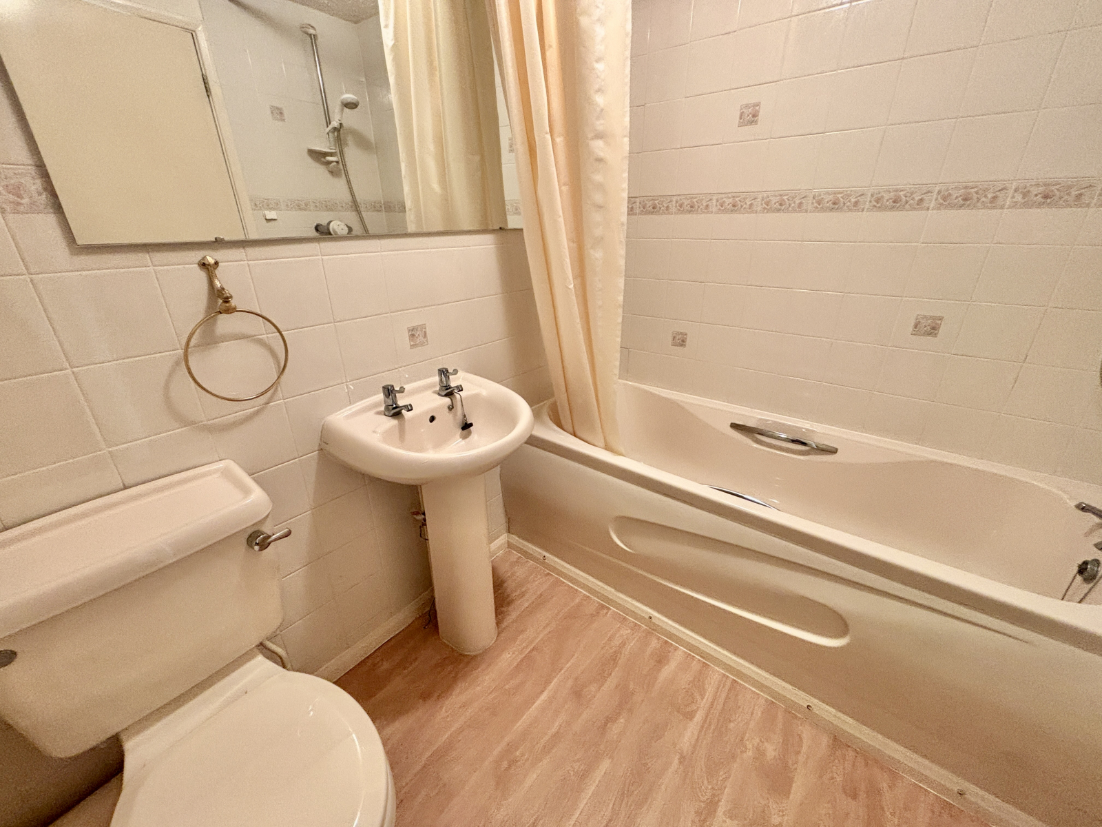 Fitted bathroom suite to include W.C and pedestal wash hand basin. Panel bath with fitted shower over. Tiled splash backs and large wall mounted mirror. Wood effect flooring, lighting and radiator.