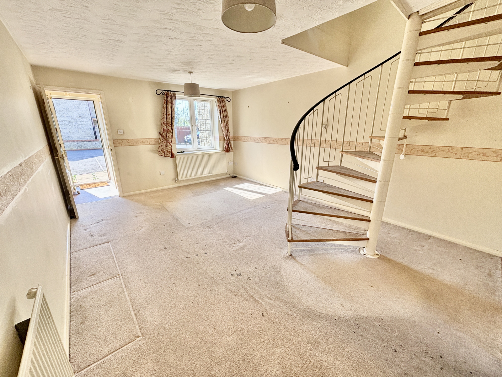 UPVC double-glazed window to the front aspect with radiator below. Two pendant ceiling lights and feature spiral staircase to the first floor. Carpeted throughout with a range of power points and second radiator. door to;