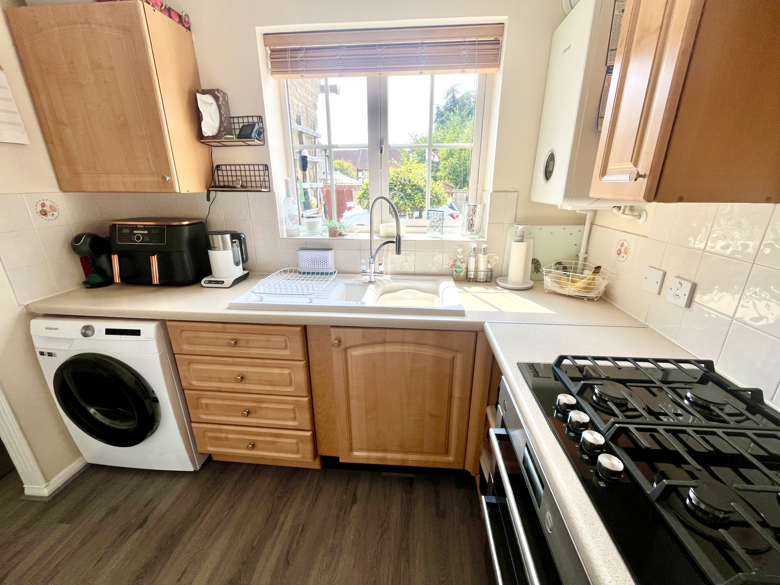 UPVC double-glazed window to front elevation. Range of base and eye level units and drawers with rolled top worksurfaces and tiled splash backs. 1 1/2 bowl stainless steel sink and drainer with mixer tap. Space for washing machine and fridge freezer. Integrated double oven and four ring gas hob. Wall mounted gas central heating boiler and range of power points. Central lighting and wood effect vinyl flooring.