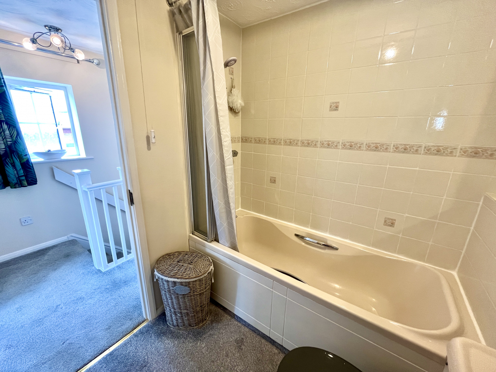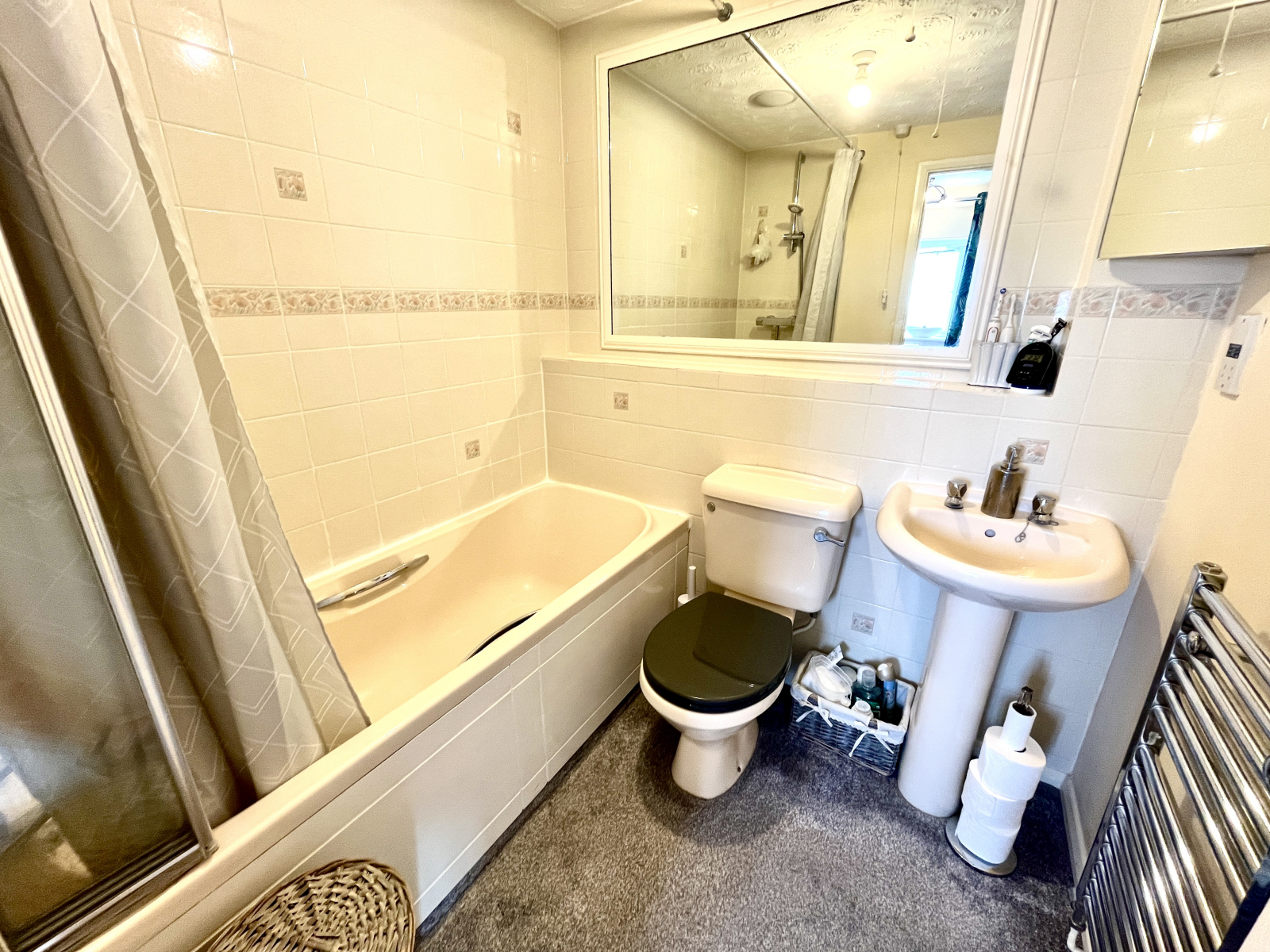 Bathroom suite comprising of W.C. and pedestal wah hand basin. Panel bath with shower over. Tiled splash backs and heated towel rail. Central lighting and large mirror.
