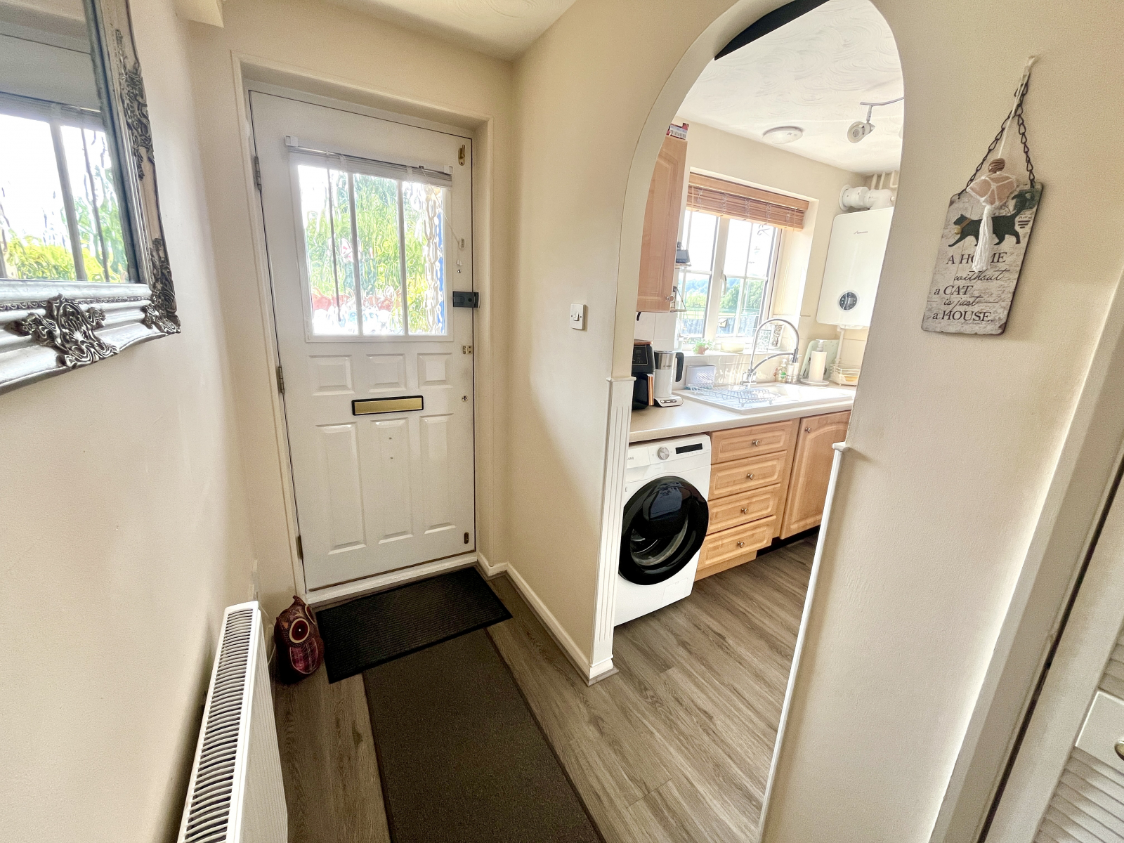 Half glazed entrance door. Wood effect vinyl flooring throughout and central lighting. Radiator and door to spacious storage cupboard. Open archway into;