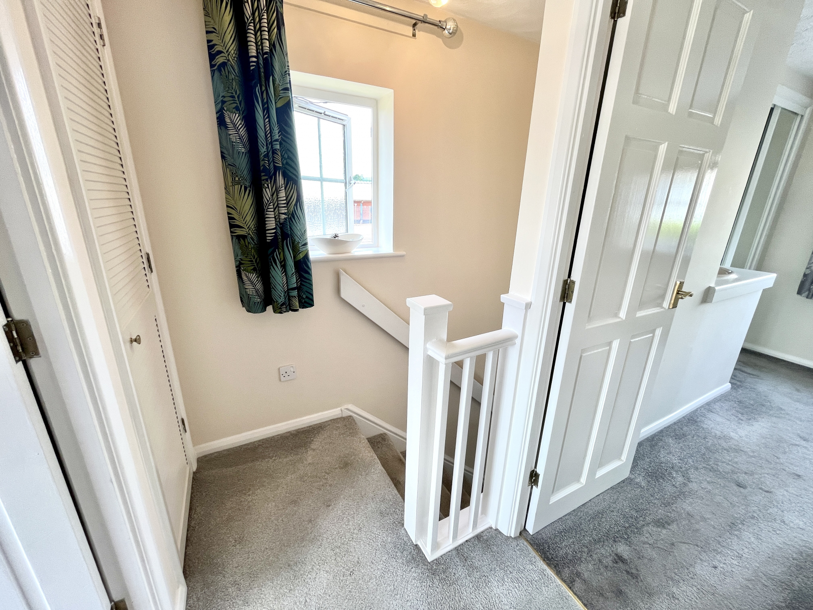 UPVC double-glazed window to the side. Carpeted with lighting and doors leading off. Door to storage cupboard with shelving.