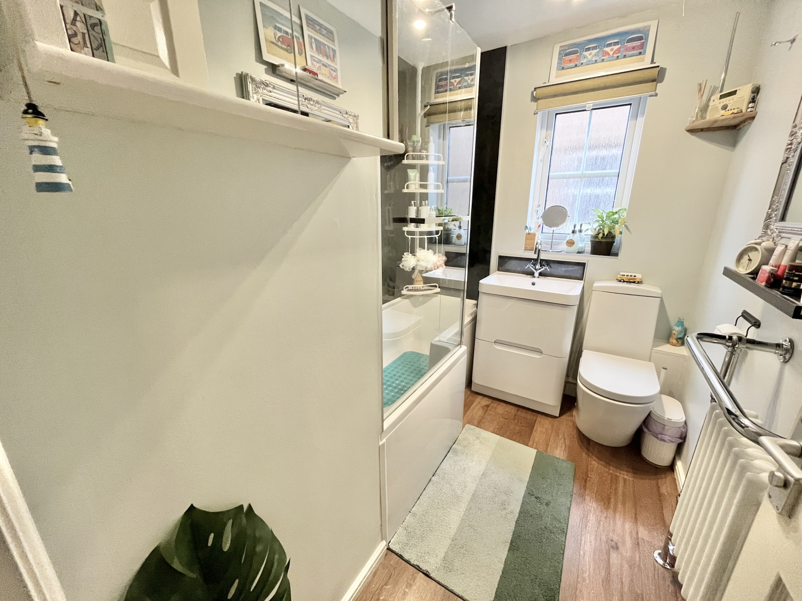 Family Bathroom UPVC double-glazed obscured window to side elevation. Modern suite comprising of; low level push button W.C and wash hand basin with mixer taps and integrated bathroom cabinet. P shaped panel bath with mixer taps. Gravity fed mixer shower over with attachments. Aqua boarding splash backs and glazed shower screen. Central lighting and extractor fan. Fitted shelving and mirrored cabinet. Vinyl wood effect flooring and antique style radiator.