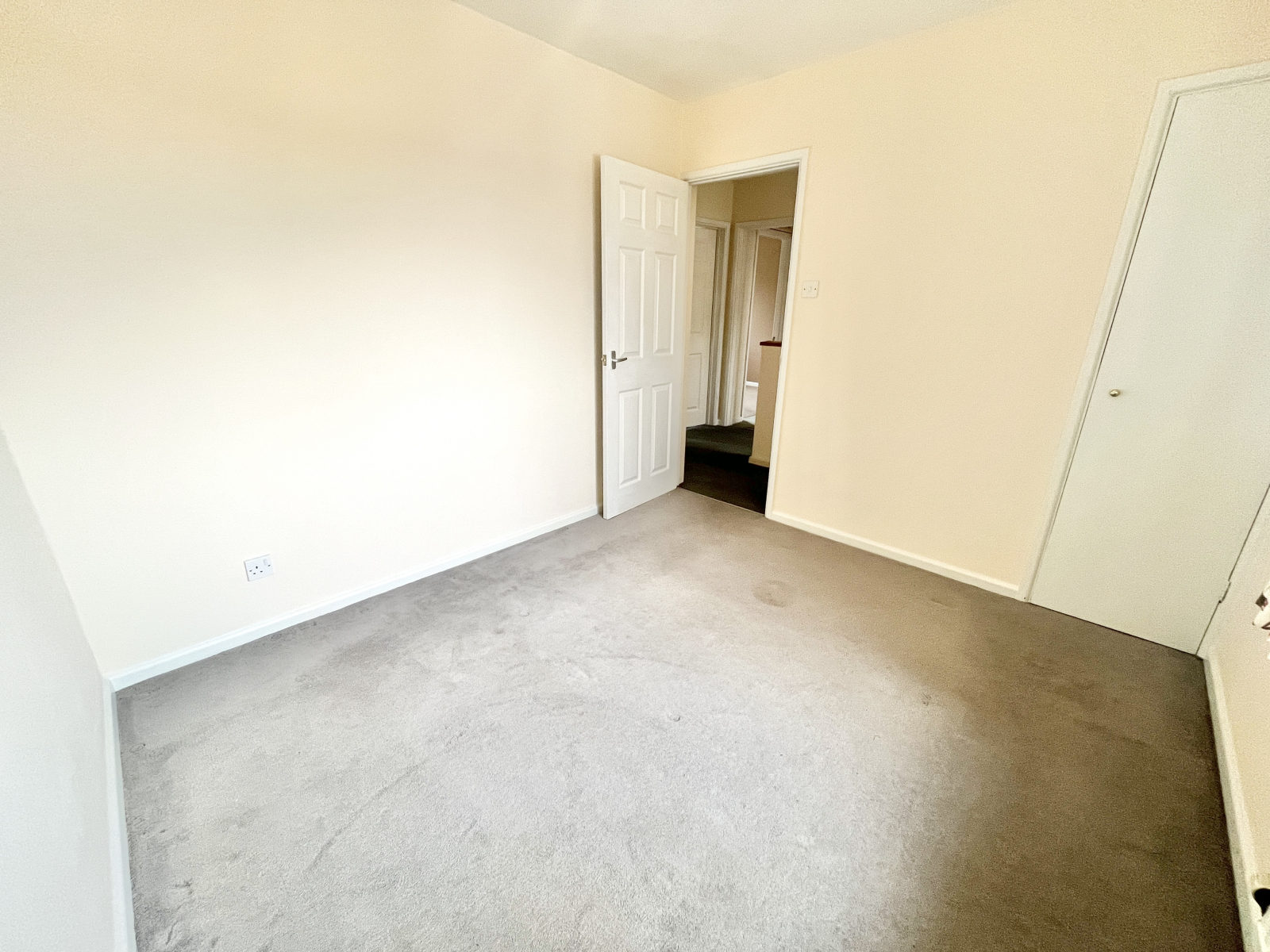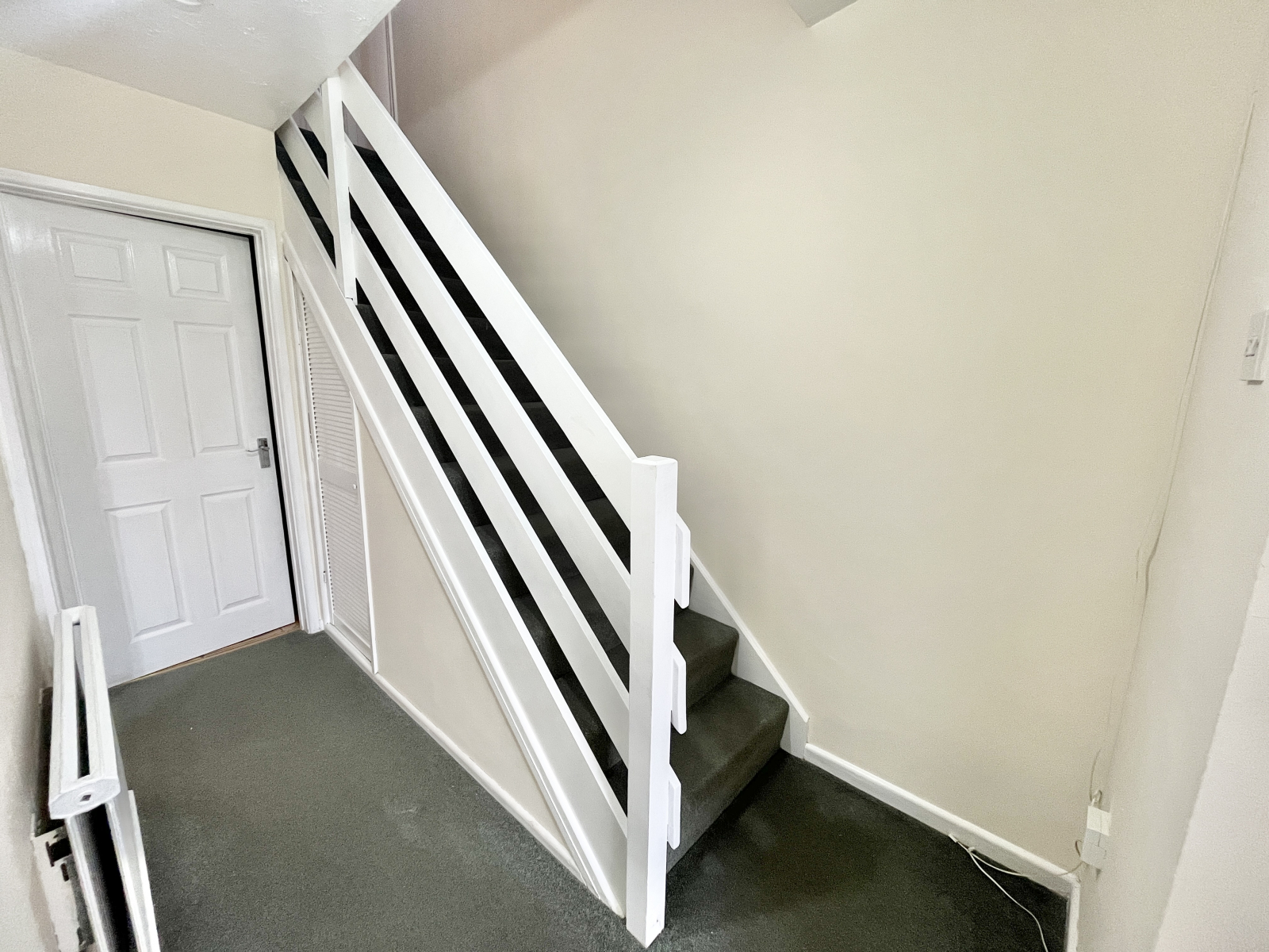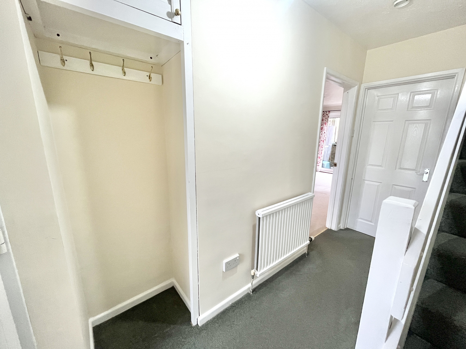 UPVC double glazed obscured glass pannel door. Carpeted flooring with open carpeted stairwell to the first floor. Storage alcove, with additional cupboard above. Radiator and power points, Doors leading off to;