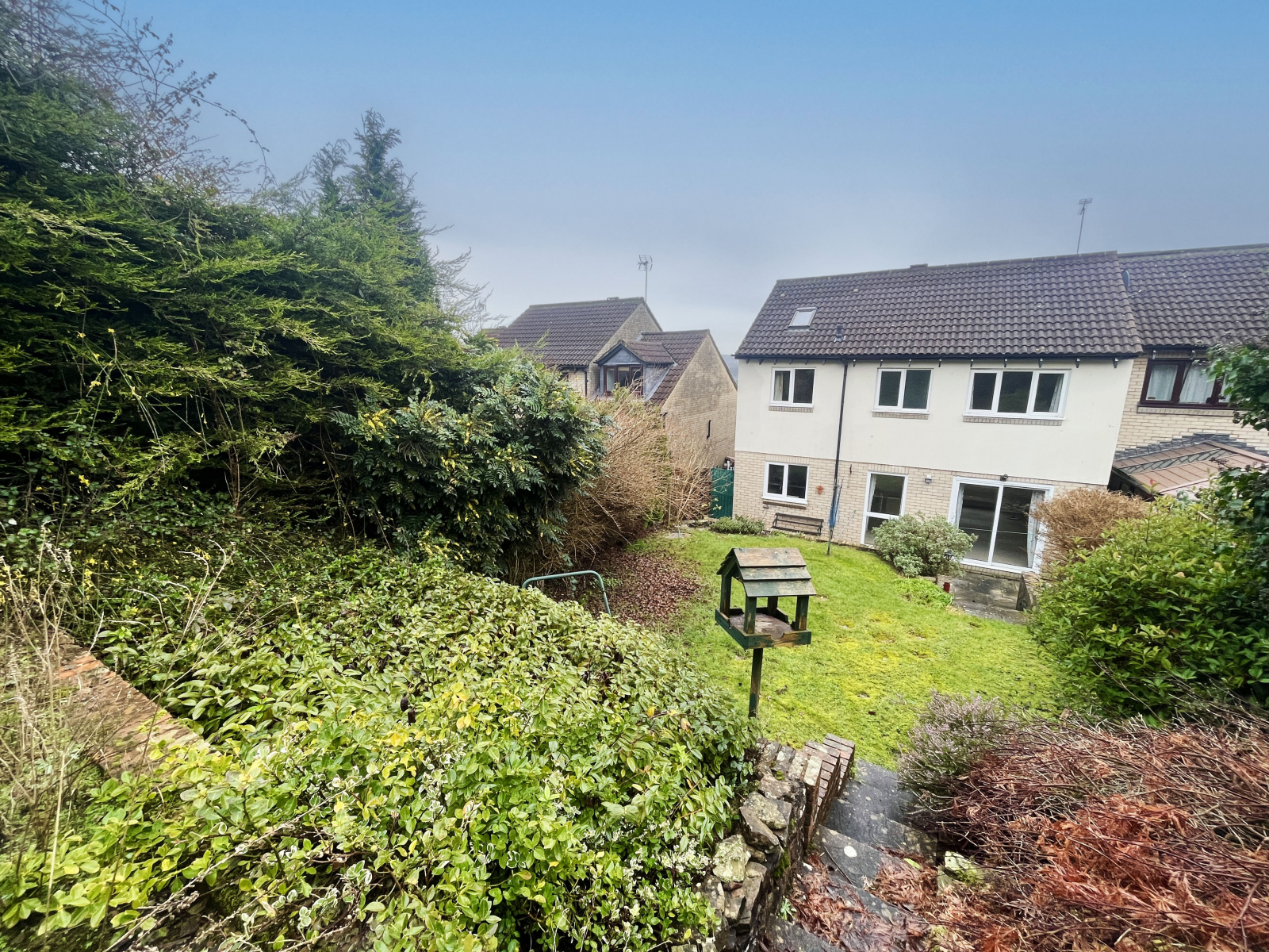 The garden has a paved patio area with steps leading to the first terrace and lawned area having matrure shubs and flower beds. Also benefitting from a wooden decking area and steps leading to second and third terrace levels. Planted with mature shrubs and flowering plants.