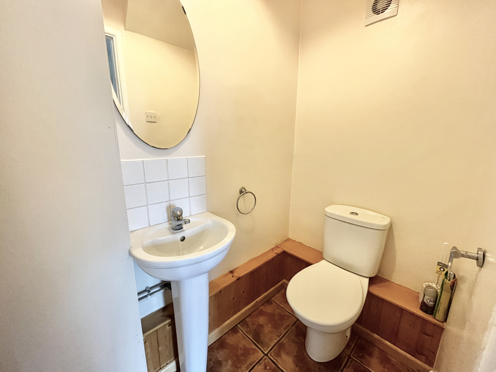 Tiled flooring, White pedestal wash hand basin with tiled splash back and W.C. Extractor fan and pendant lighting.