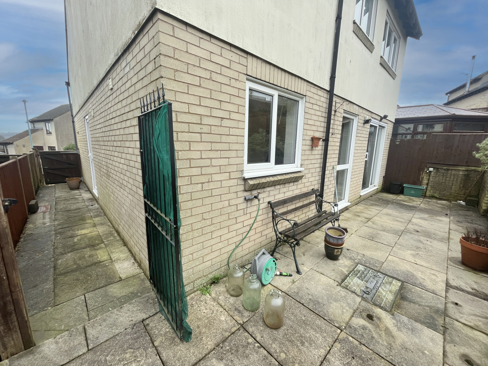To the side, the property has a paved pathway which gives access to the front garden. Secured with two garden gates.