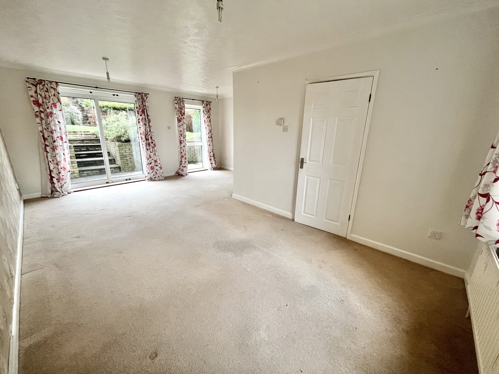 UPVC Double glazed window to front elevation with views over the front garden and forest beyond. Carpeted flooring with double glazed UPVC patio doors to rear garden and floor to celing double glazed UPVC window to rear elevation. Pendant lighting and two radiators. Coved ceiling and powerpoints.