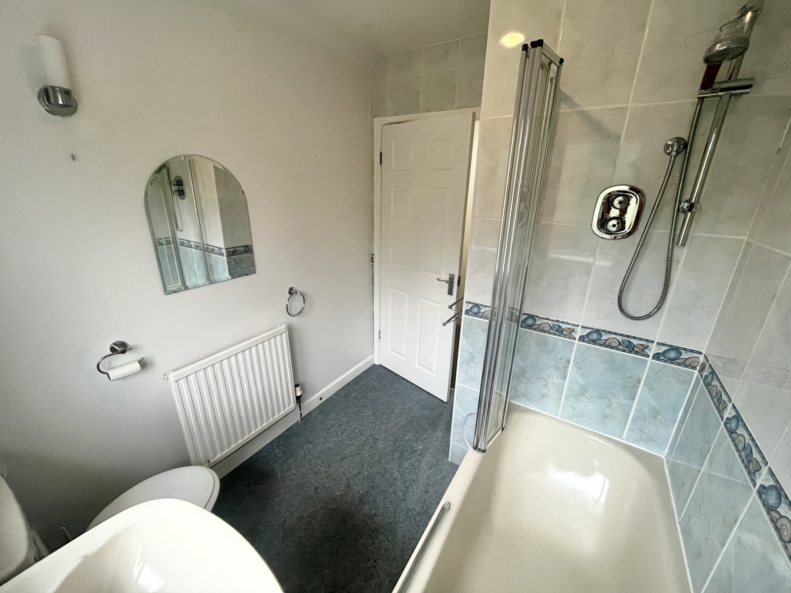 UPVC double glazed obscured window to rear aspect. Vynil flooring. Cream bathroom suite comprising of; panel bath with shower over, fixed hand rail, and glass shower screen. Pedistal wash hand basin, and W.C. Tiled splashbacks and radiator.
