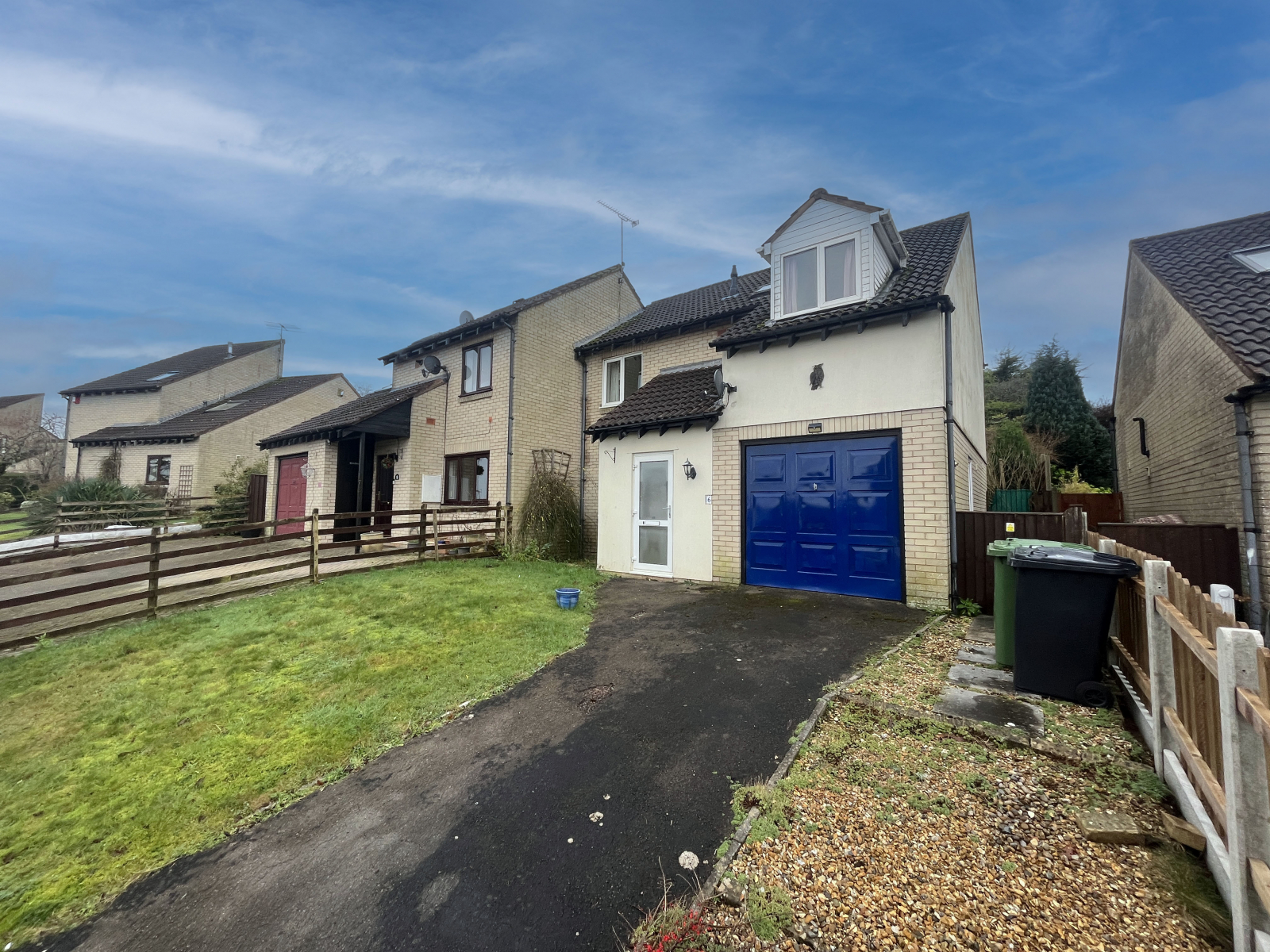 A Gated driveway gives access to the garage and main entrance. The front garden is laid to lawn with gravelled areas and fenced boundaries.