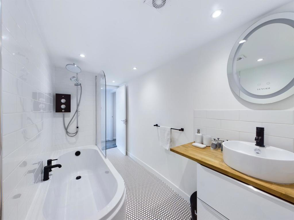 Bathroom - 1.59m x 3.83m (5'2" x 12'6") - Recently modernised. Having white suite comprising of low level push button W.C, panel bath with Matt black mixer taps and Mira black electric shower over with rain head attachments. Glazed shower screen and spot lighting. Feature sink with matt black mixer tap and wooden work surface having vanity unit under with drawers for storage. Feature illuminating mirror and metro tiled splash backs. Vinyl flooring and extractor fan.