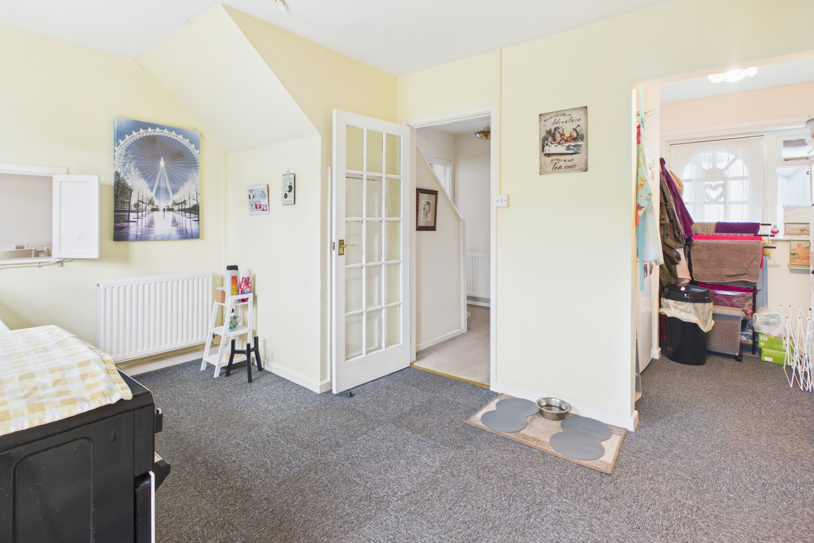 Wooden external door with obscure glazed panels to front aspect. Single glazed obscure window to side. Small wall mounted radiator, carpeted flooring, pendant lighting and power points.
