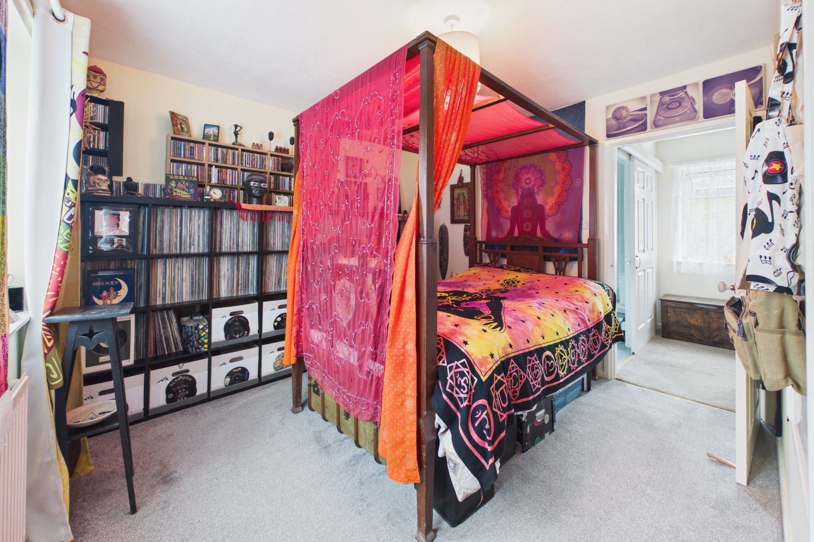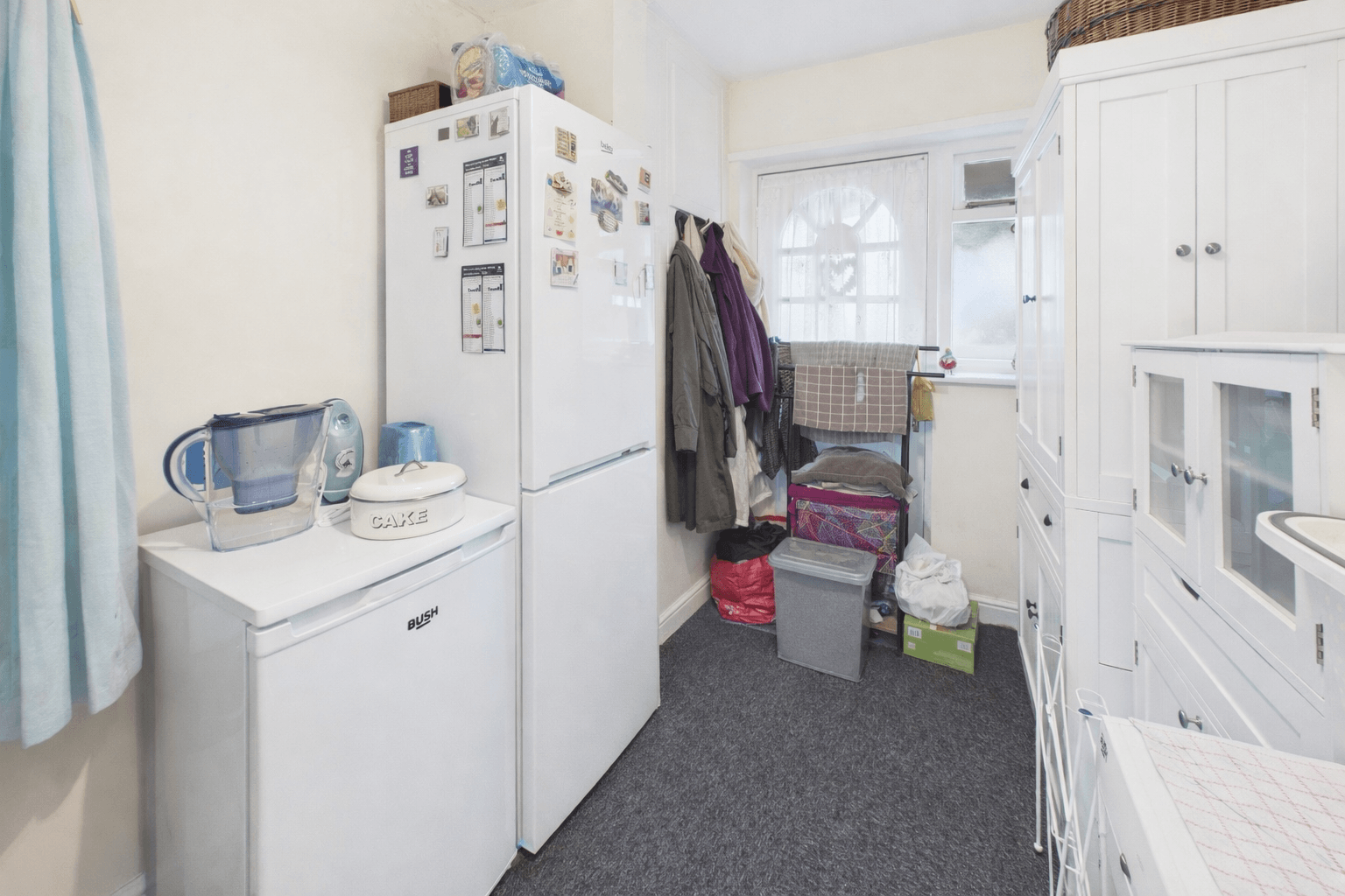 Double glazed Georgian style UPVC window to front aspect with radiator below, carpeted flooring, over bulkhead storage cupboard, skirting boards, central pendant lighting and power points.
