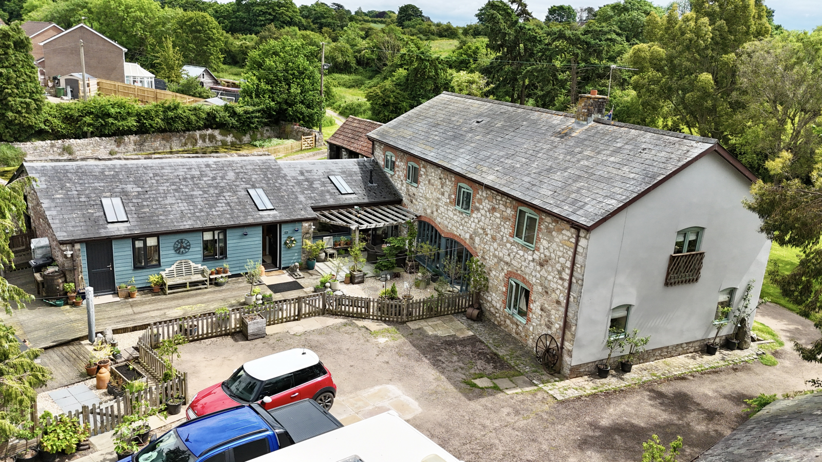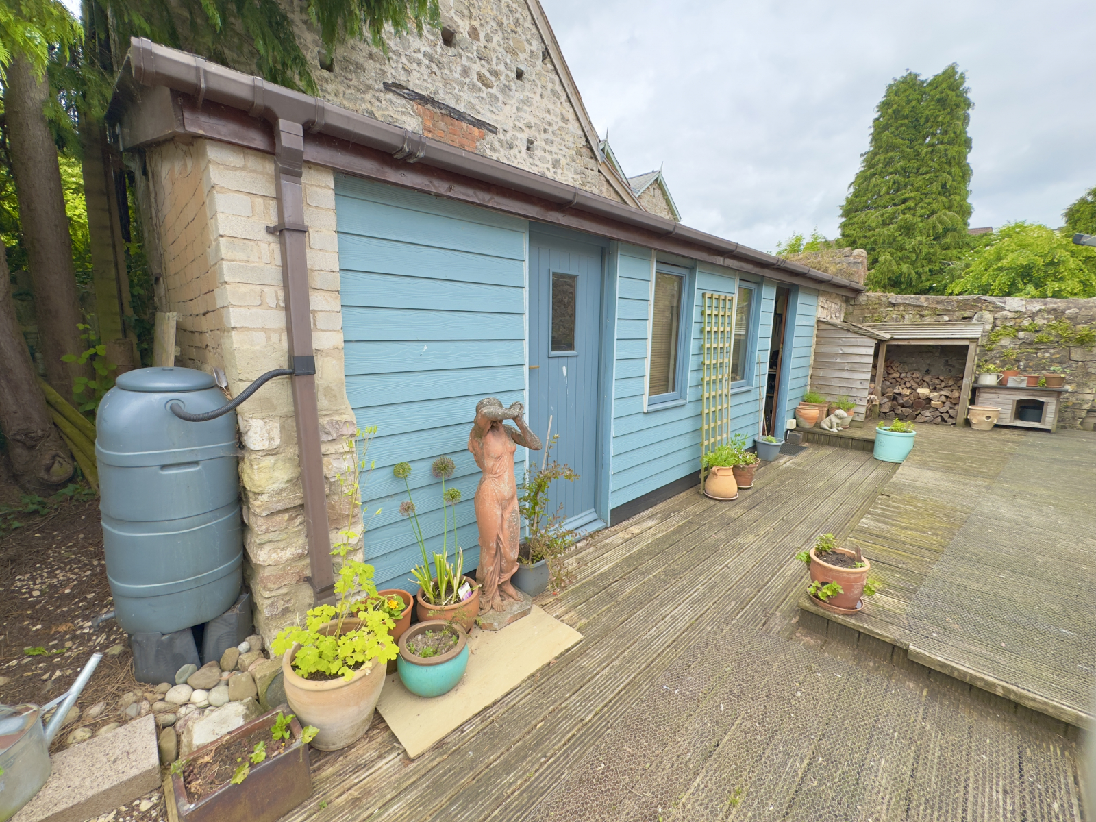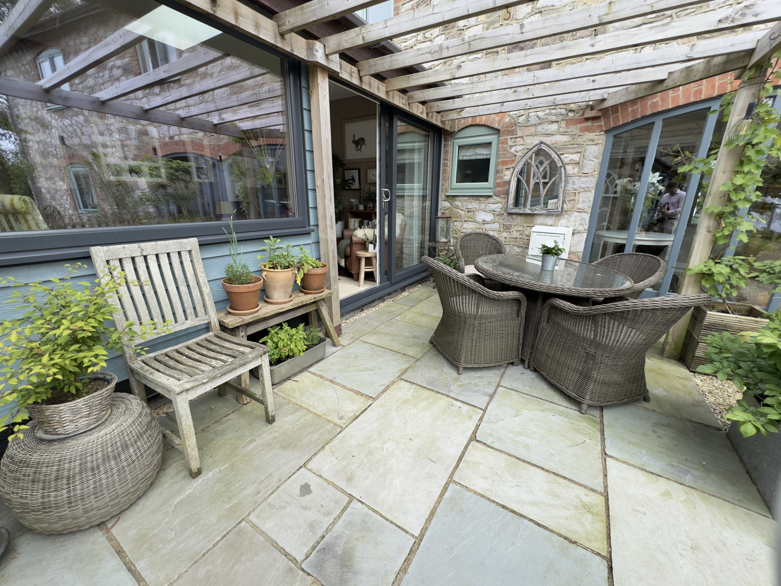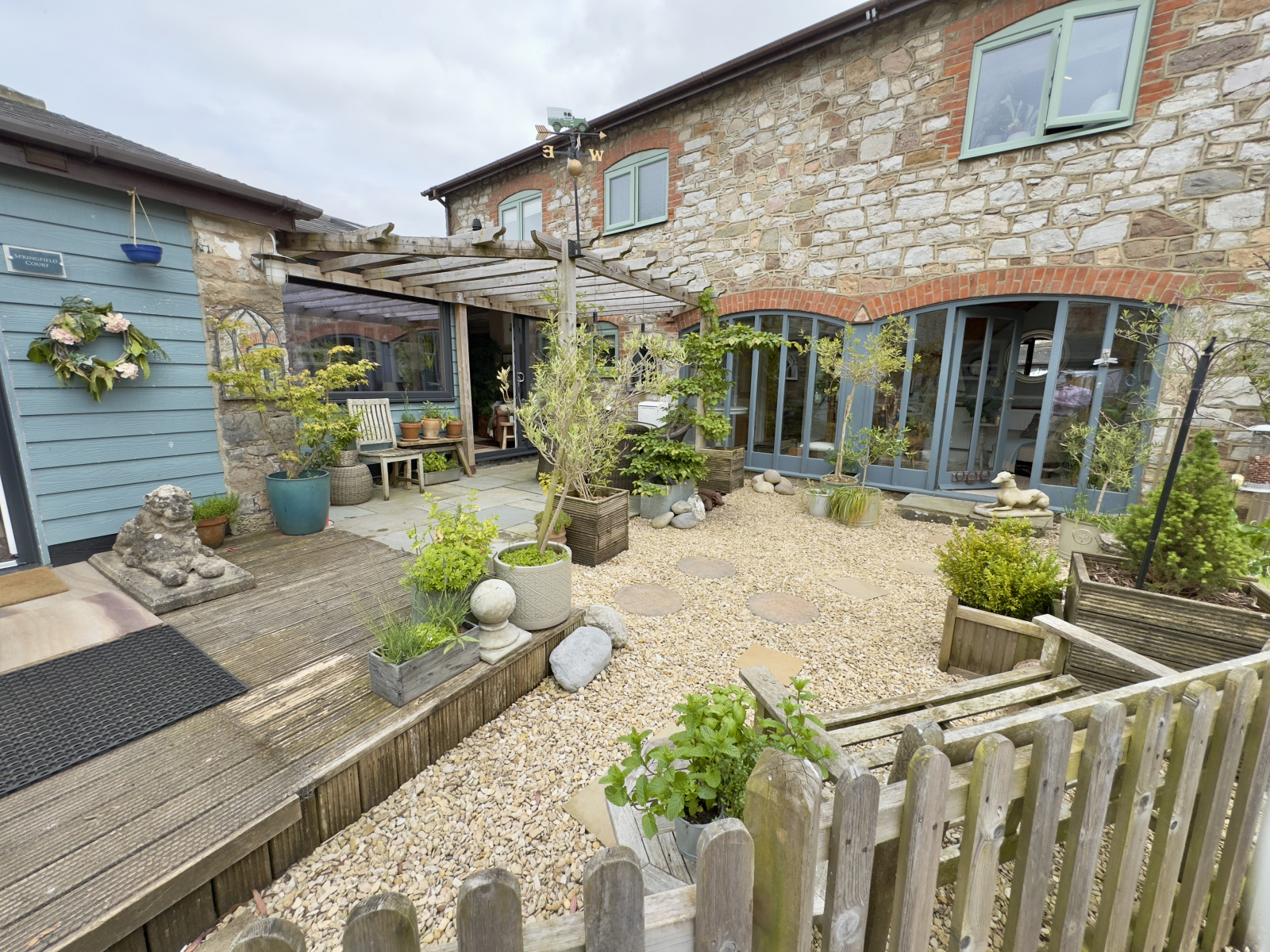 wooden pergolas and climbing flowering plants. This area is perfect to sit and enjoy the tranquillity of countryside living. Further areas are pebbled in Cotswold stone with stepping stones leading to the front door. A large decking area provides further seating space and gives access to the workshops and summerhouse.