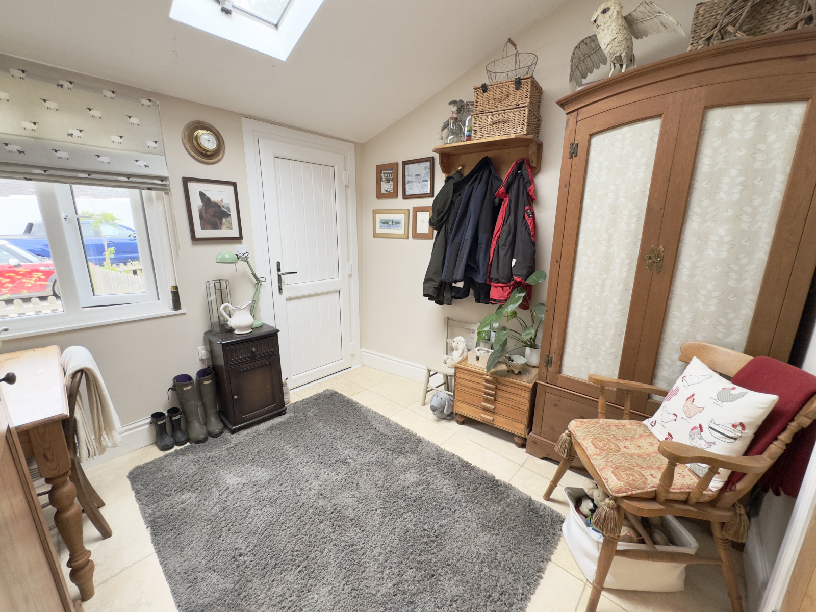 This very useful space is perfect for countryside living. Having a UPVC double-glazed door to the front aspect and loft window. Fitted grey base units with oak worktops and tiled splash backs. Space for washing machine and Belfast-style sink with mixer tap. Vaulted ceiling with exposed beam, extractor fan and power points.