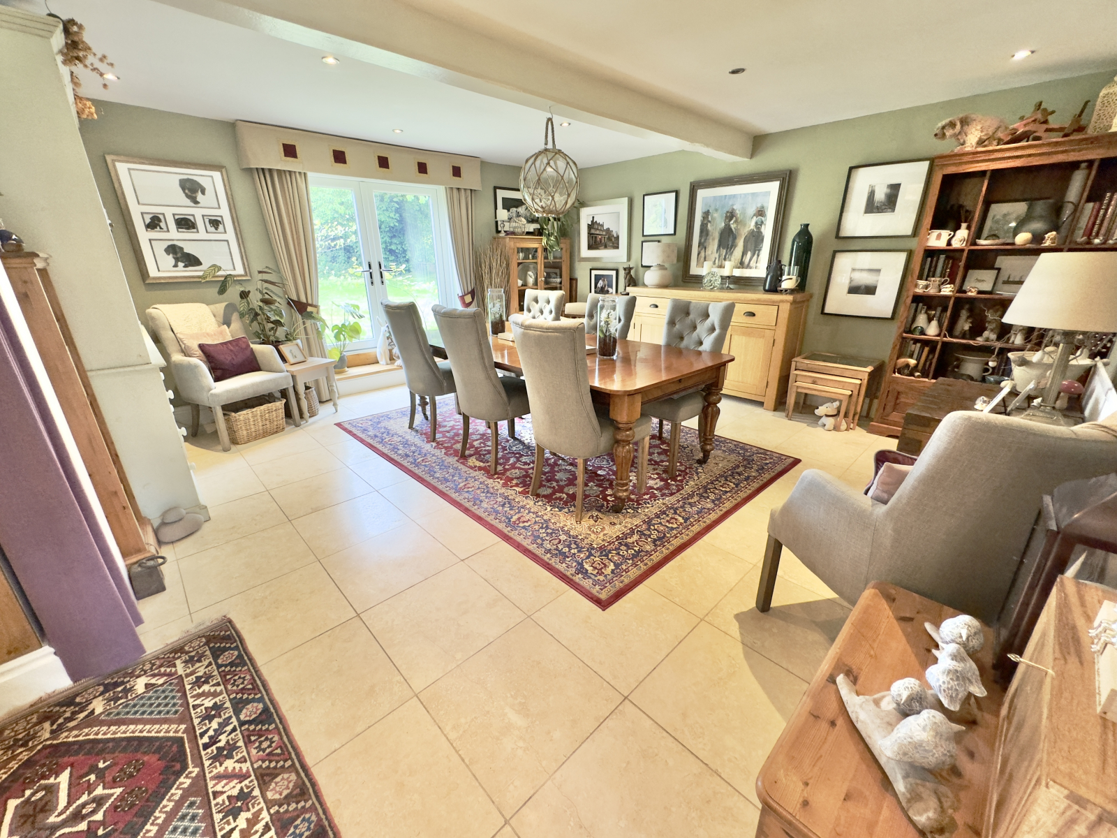 Beautifully presented with bespoke UPVC double-glazed double doors with wooden steps leading to the rear garden. Exposed beams and feature spotlighting. Space for a large dining table with tiled flooring and a range of power points. Open into;