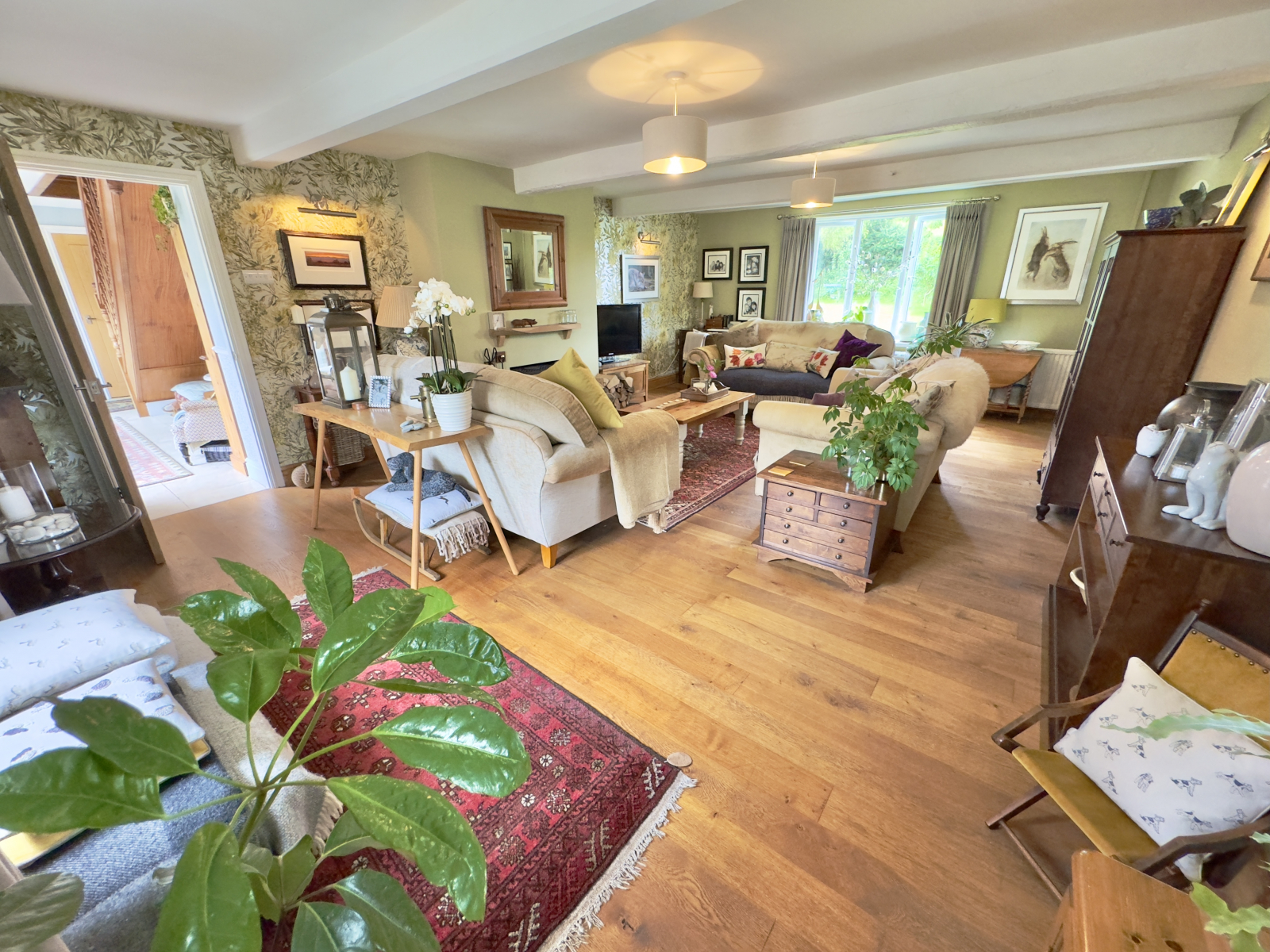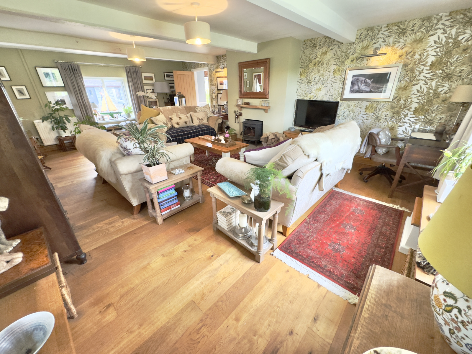 This exceptionally spacious and cosy room is full of character with exposed beams and oak flooring. UPVC double-glazed windows to three elevations deliver an abundance of sunlight and a beautiful outlook. Central pendant lighting and additional wall lighting. Welcoming fireplace with stone hearth and fitted wood burner. Two radiators and a range of power points.