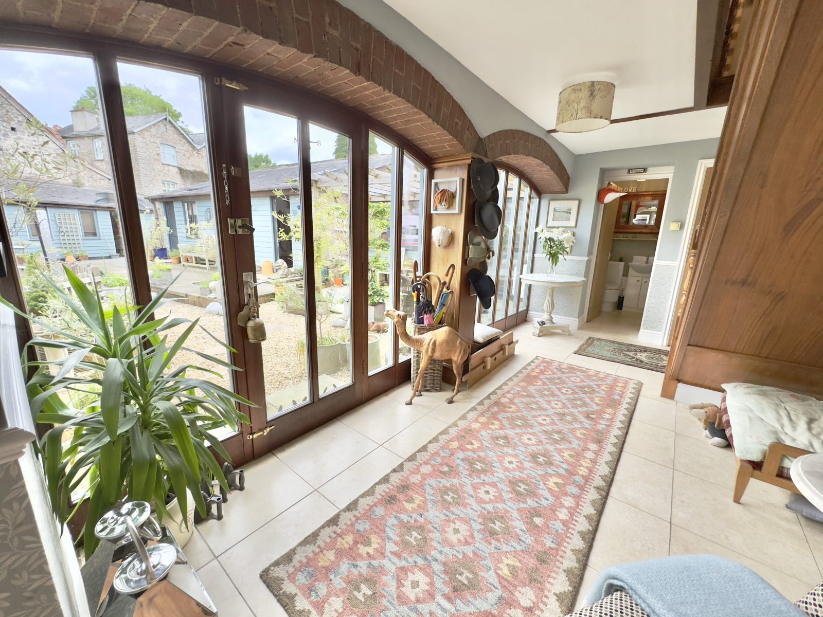 Beautiful arched wooden doorway and double-glazed windows flood this spacious room with natural light. Tiled flooring throughout, and open carpeted stairwell to the first floor. Feature exposed brick arches and beams. Radiator and Dado rail. Pendant lighting and a charming area for seating. Wall-mounted central heating controls and fitted cupboard with an abundance of shelving.