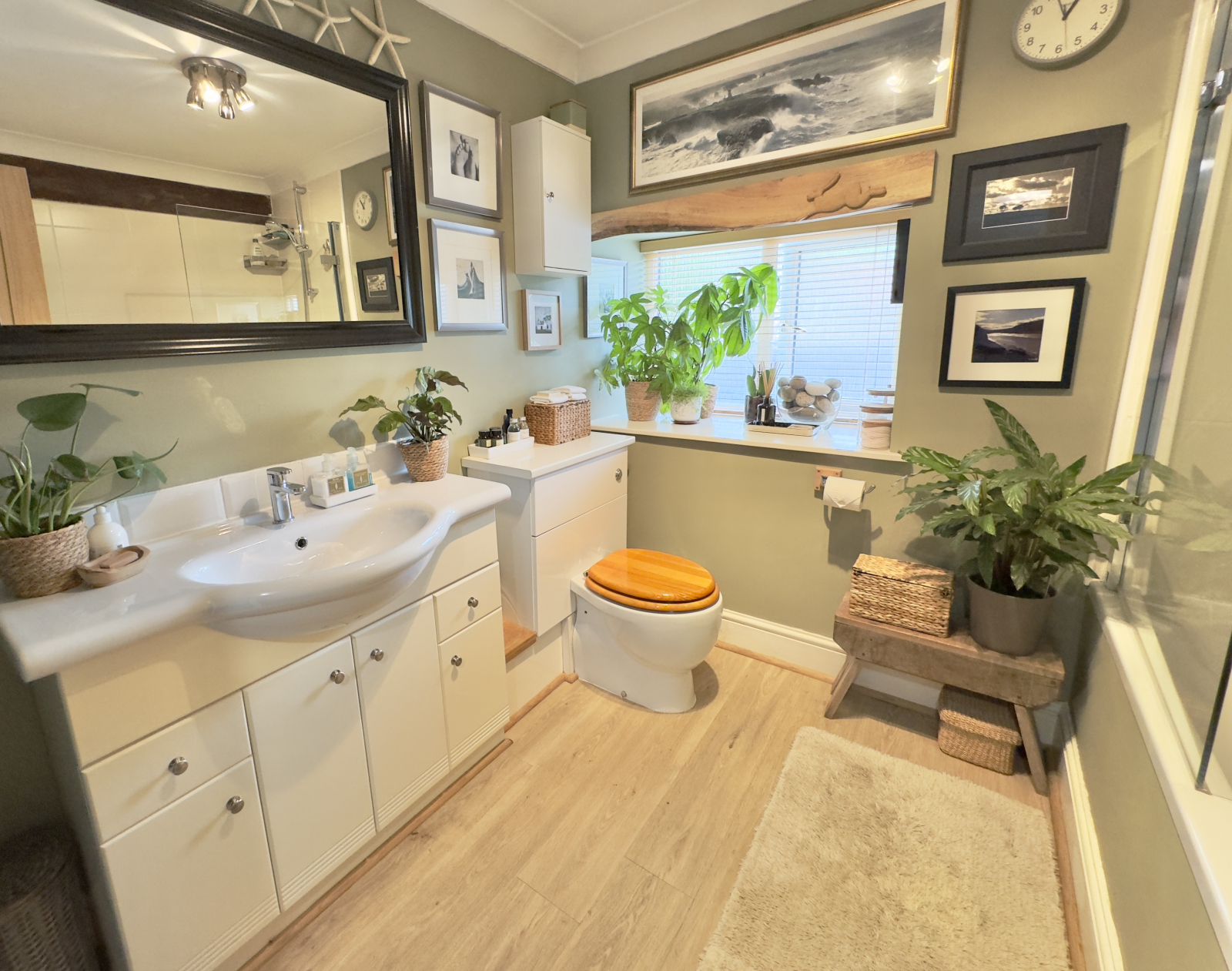 Obscured UPVC double-glazed window to front elevation. Well-appointed modern suite comprising of; low-level push button W.C and large vanity unit incorporating wash hand basin and mixer tap with tiled splash backs. Panel bath with glazed screen and fully tiled with power shower and attachments. Wood effect flooring and exposed beam. Heated towel rail and bespoke shelving. Coved ceiling and central lighting.