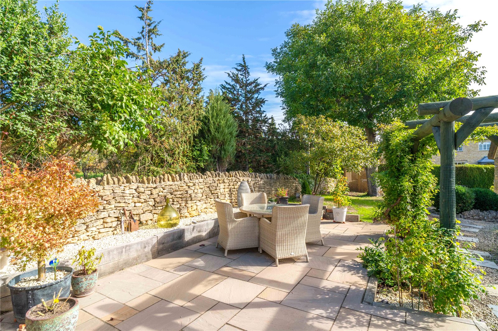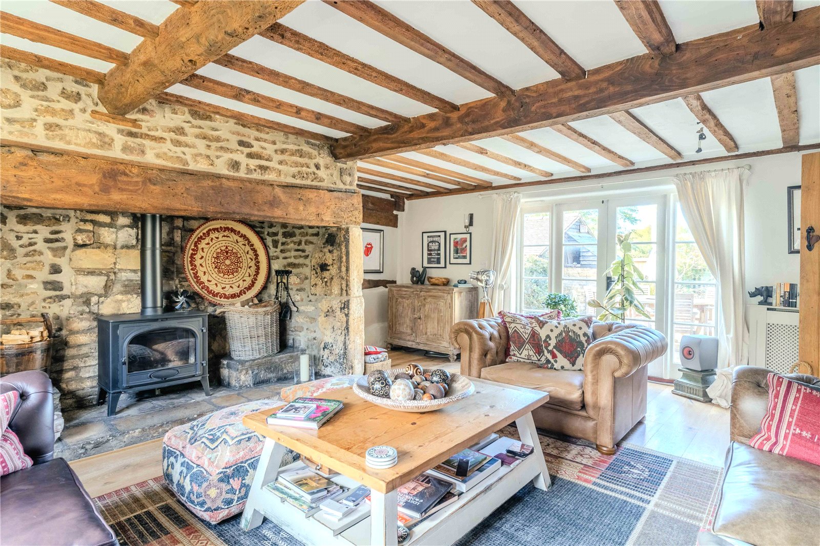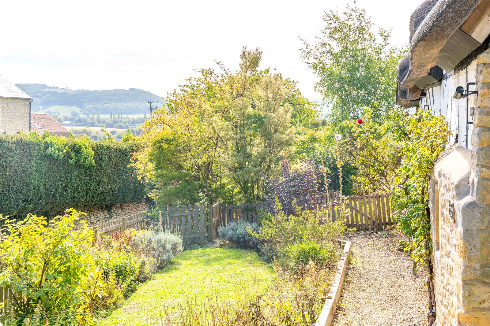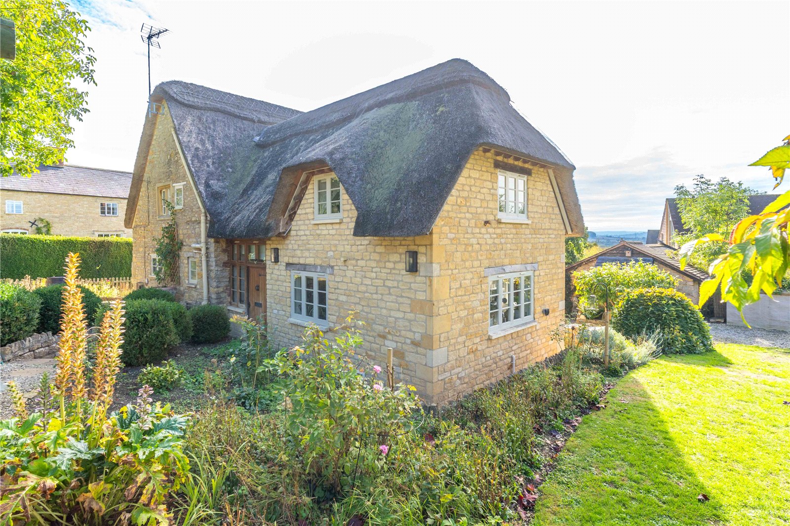 Old Walnut Cottage is a perfect example of a traditional English thatched home, beautifully restored and thoughtfully modernised throughout. Set behind a picket fence and surrounded by mature gardens, this Grade II listed property is full of original features, including exposed beams, flagstone floors and exposed stonework. The ground floor accommodation briefly comprises a spacious sitting room with a large inglenook fireplace housing a wood-burning stove, engineered oak flooring, and French doors opening onto a private paved terrace, a cosy snug with exposed timbers, and a triple-aspect kitchen with underfloor heating and views over the garden, which is well-equipped with a comprehensive range of base and wall units, double Belfast sink, oak cabinets and a stable door leading directly to the garden. Additional ground floor spaces include a practical boot room with stone-tiled floors, a Belfast sink, oak worktops, and a separate WC. An oak staircase leads to a bright mezzanine landing on the first floor, which provides access to four double bedrooms and a family shower room. The principal bedroom benefits from built-in storage and a modern en-suite shower room.