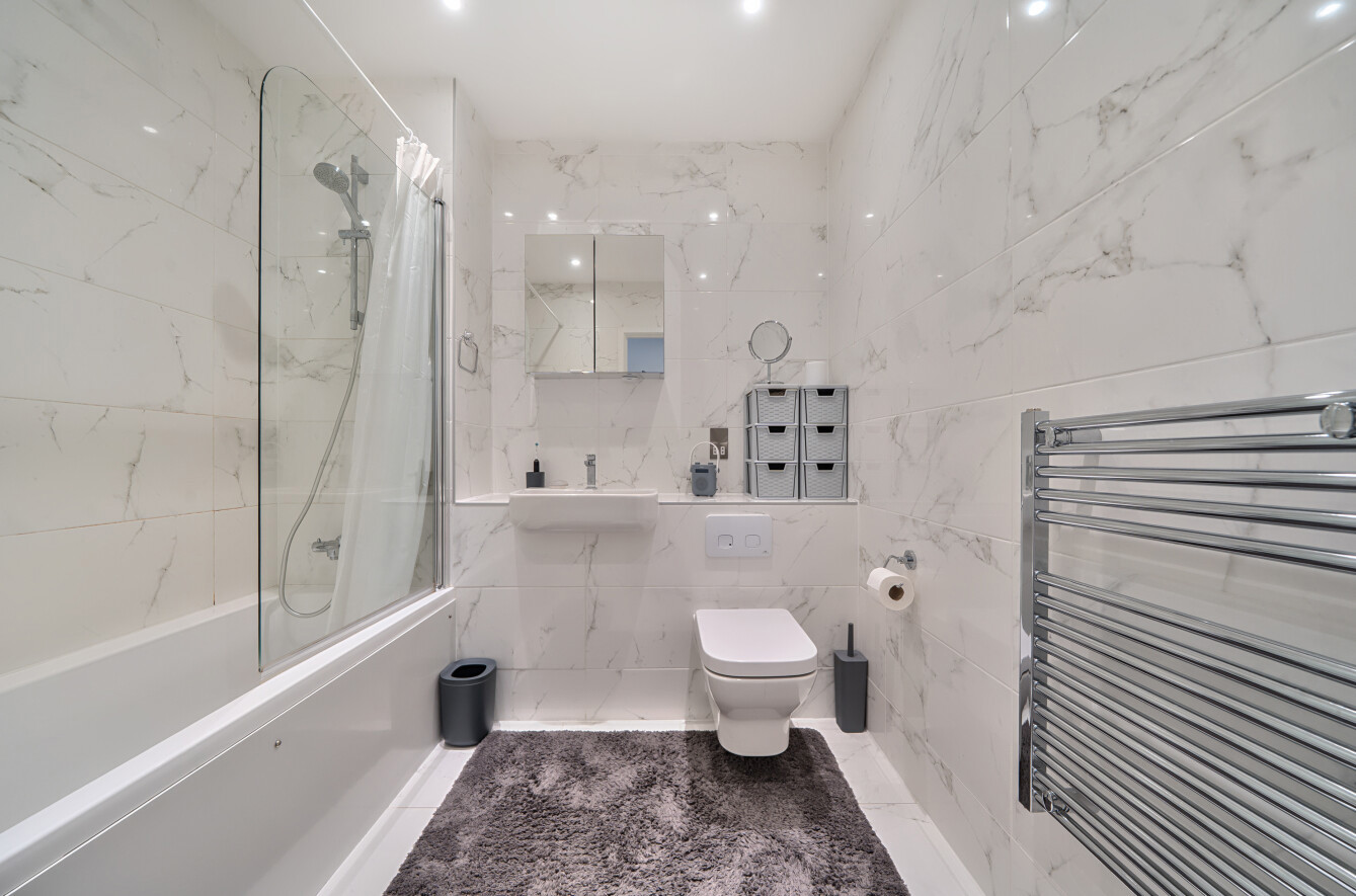 - Contemporary bathroom with white suite and shower over bath