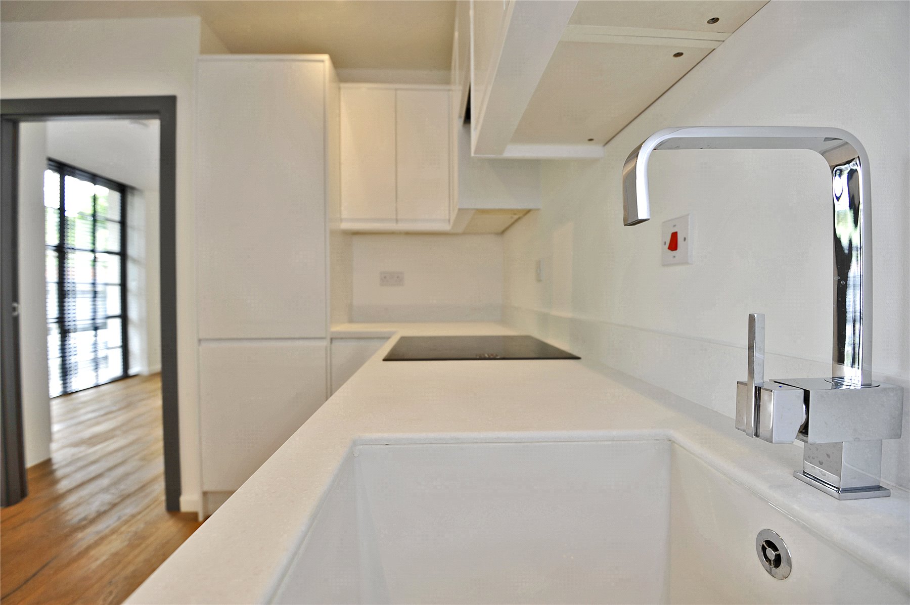 - Sleek handle-less kitchen with white countertops and integrated appliances