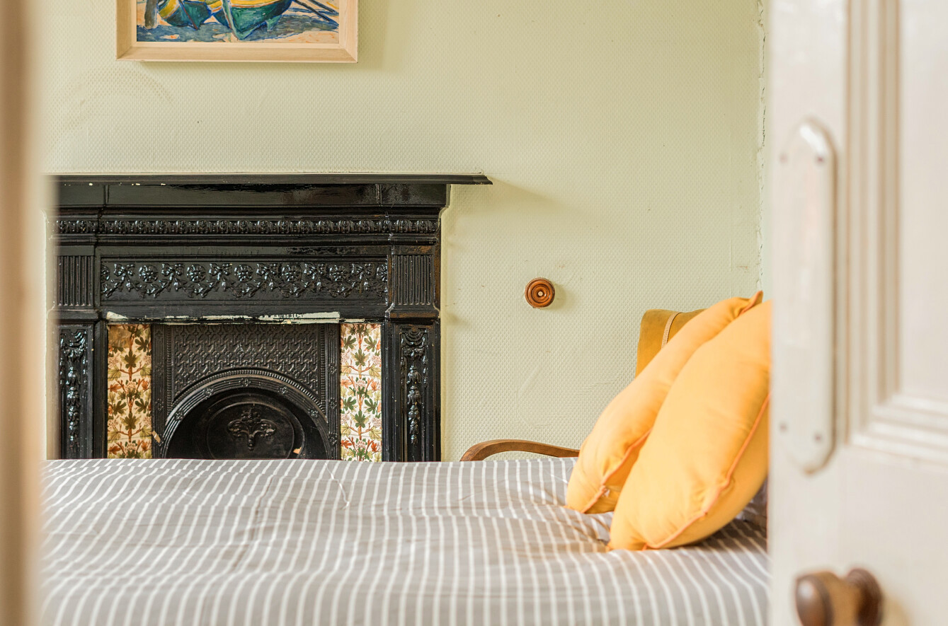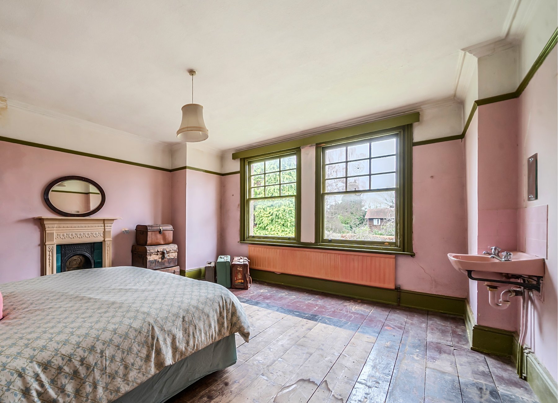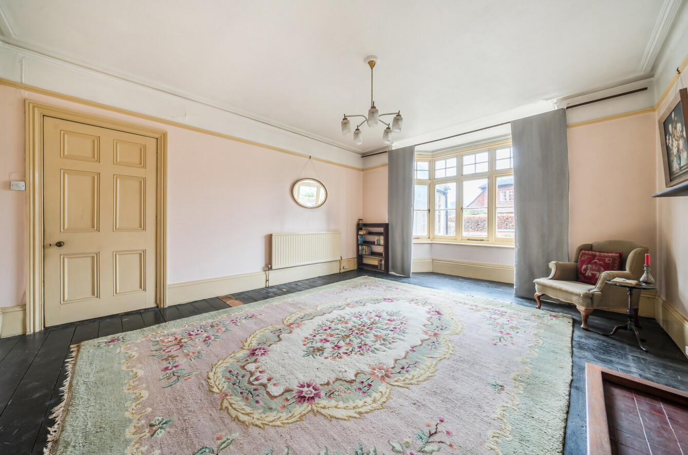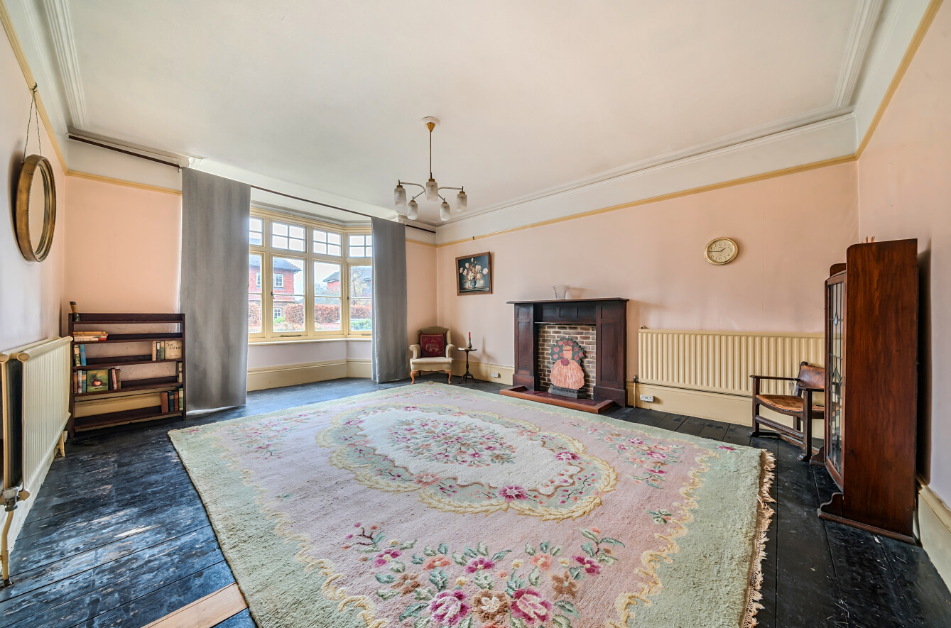 - Drawing room with bay windows, timber floors and fireplace