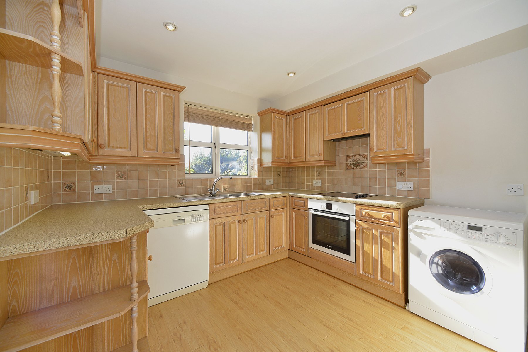 - Kitchen equipped with limed oak-fronted units, integrated appliances, and space for freestanding ones.
