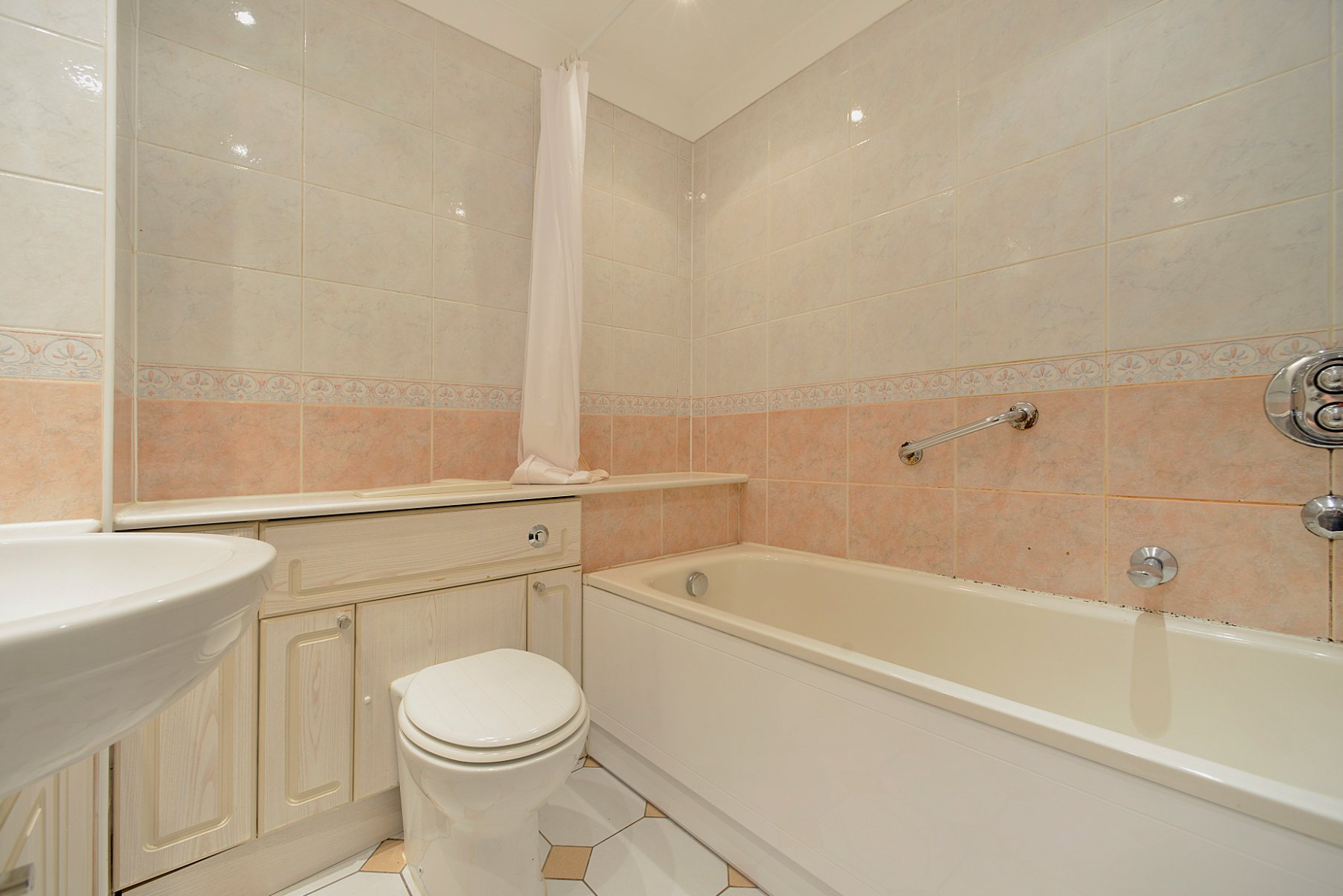 - Modern, fully tiled bathroom with thermostatic shower and vanity cupboards.