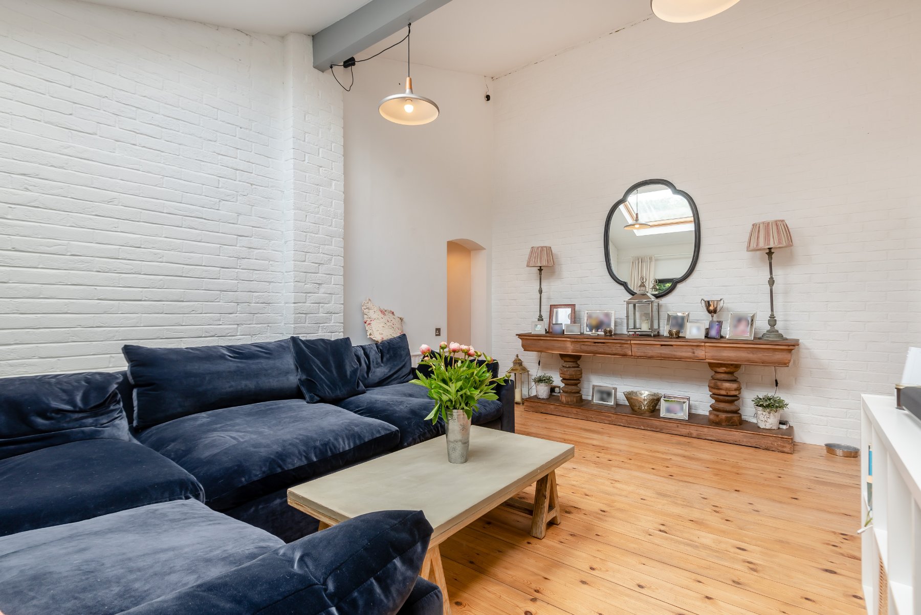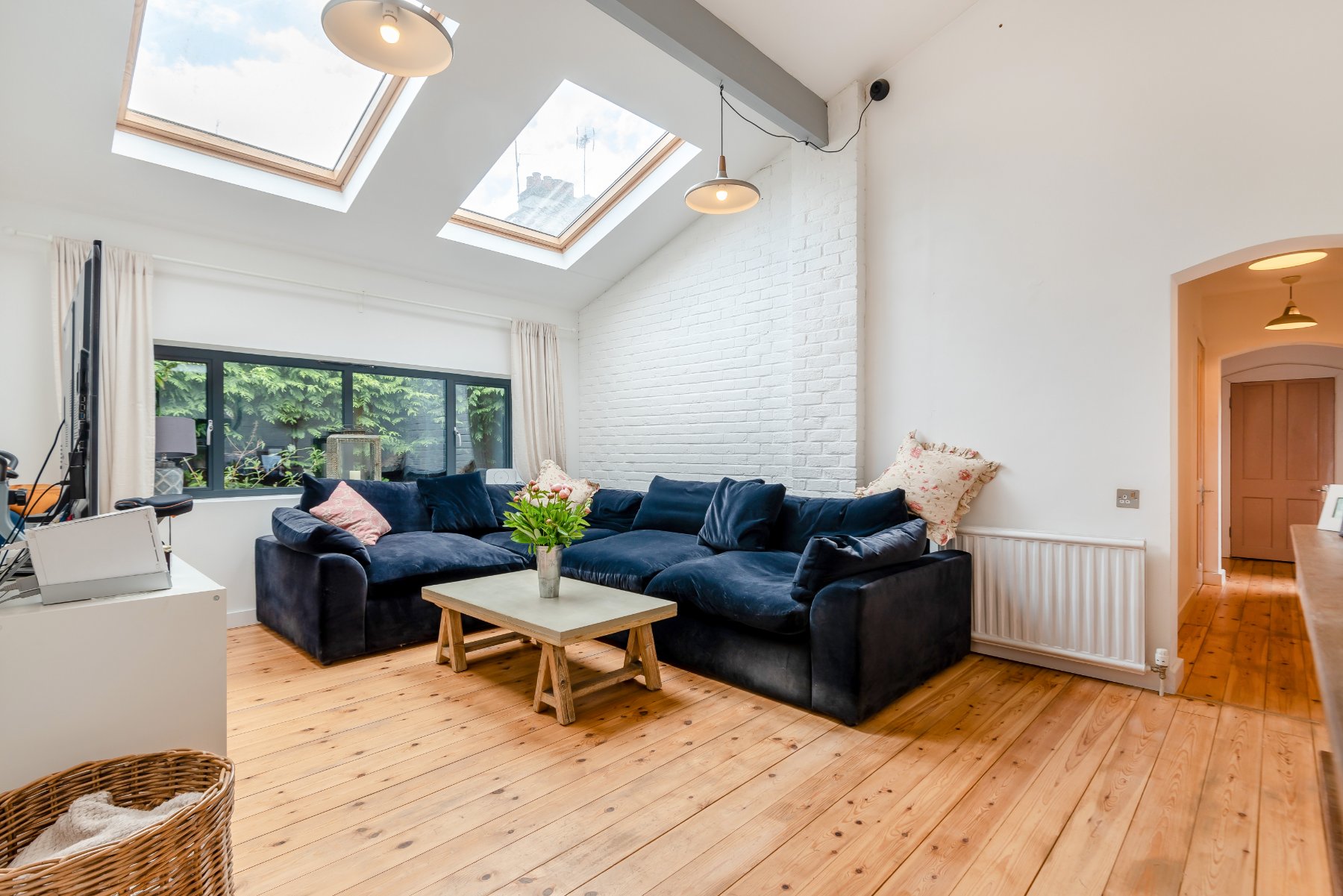 - Spacious living room with vaulted ceiling and twin skylights