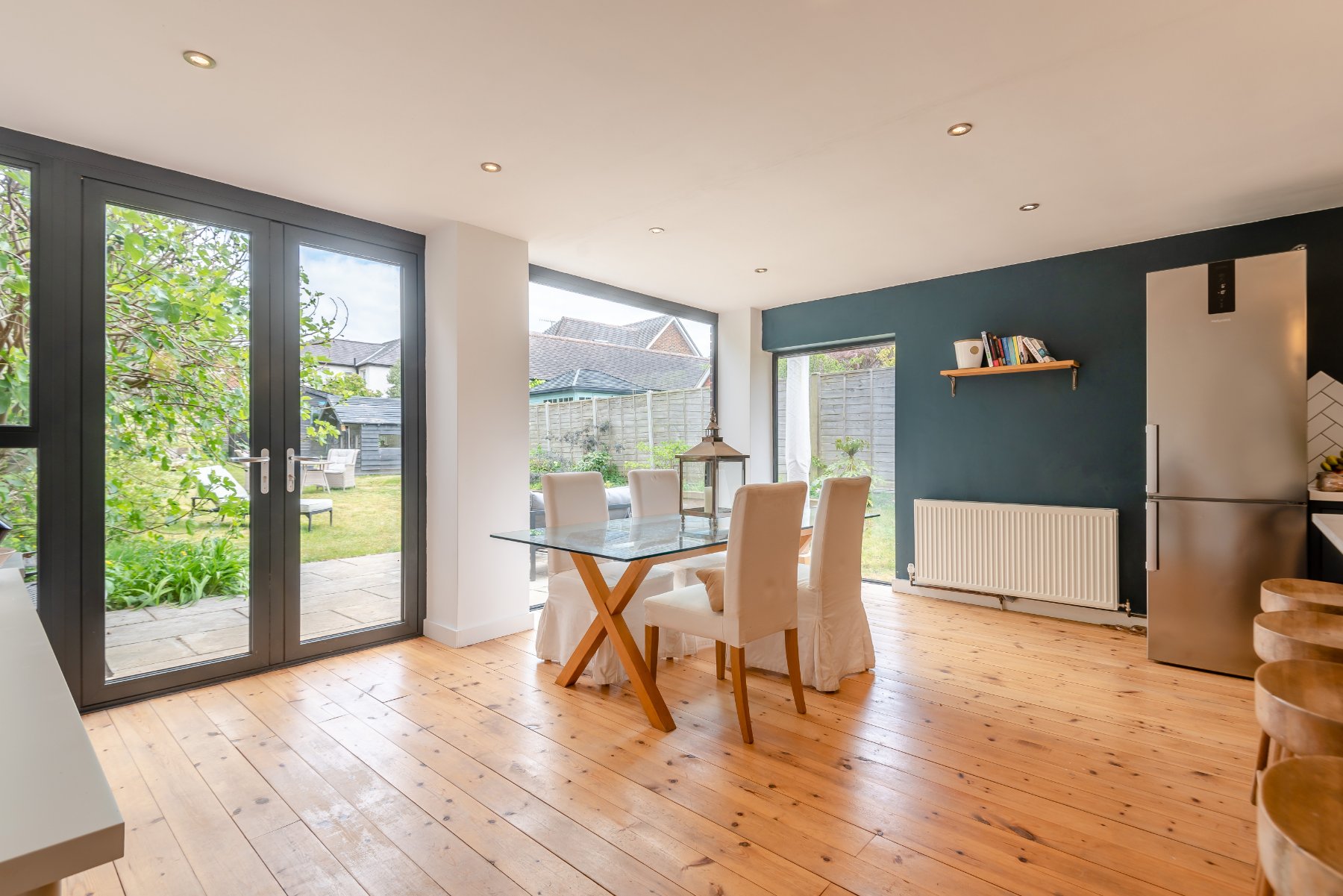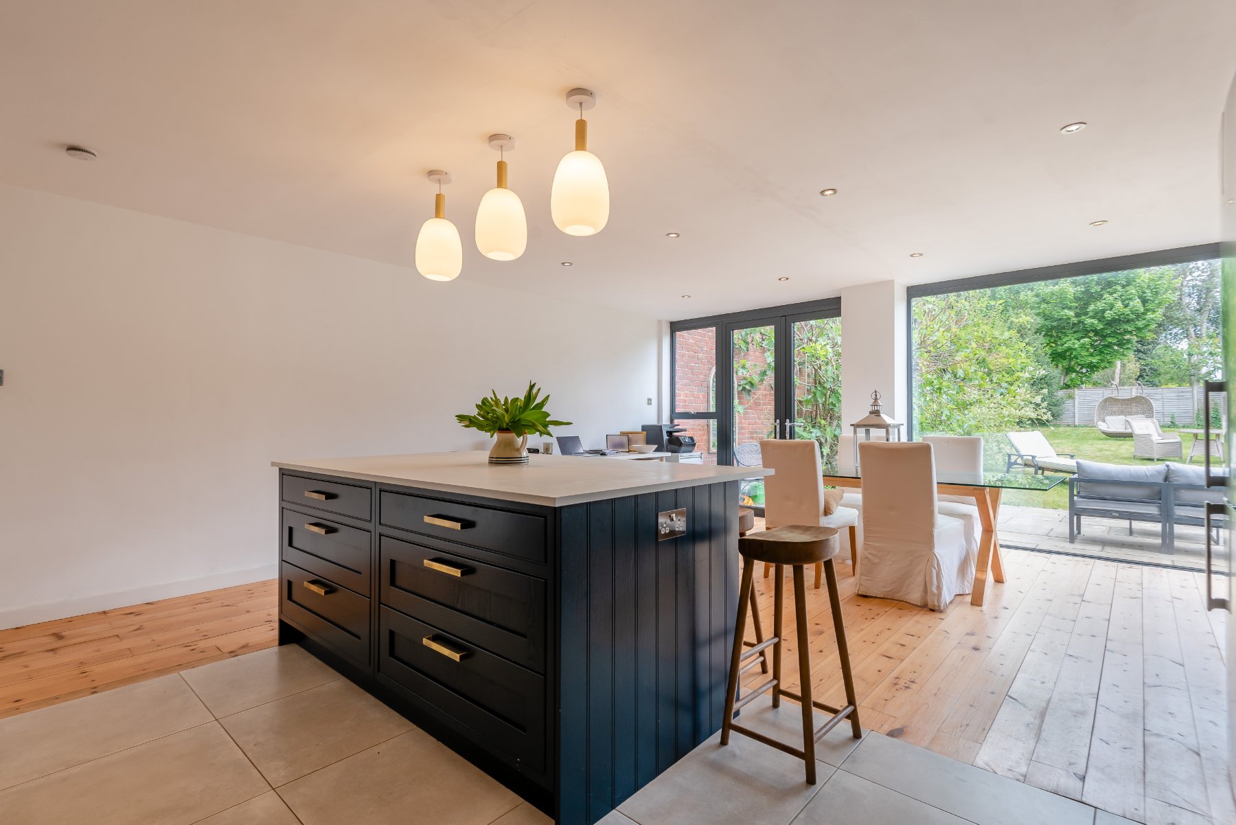 - Magnificent kitchen/reception/dining room with floor to ceiling windows and doors to the patio