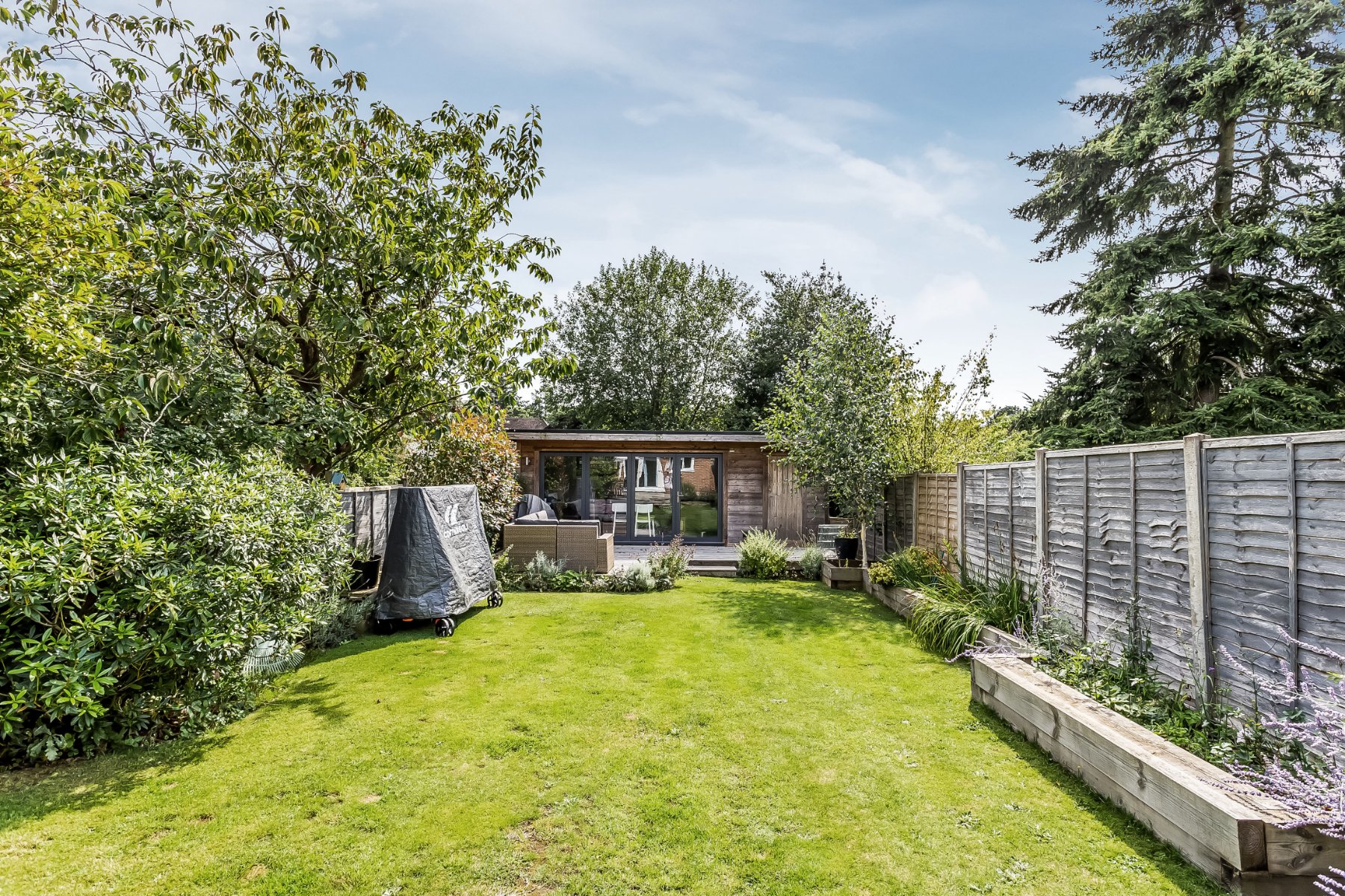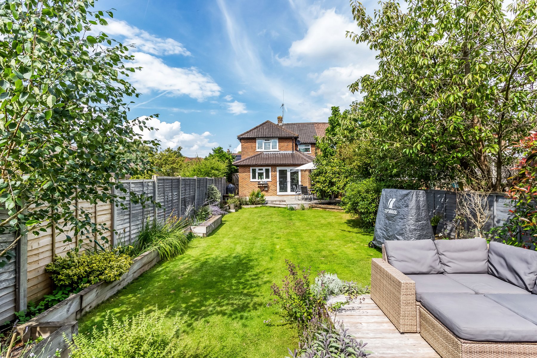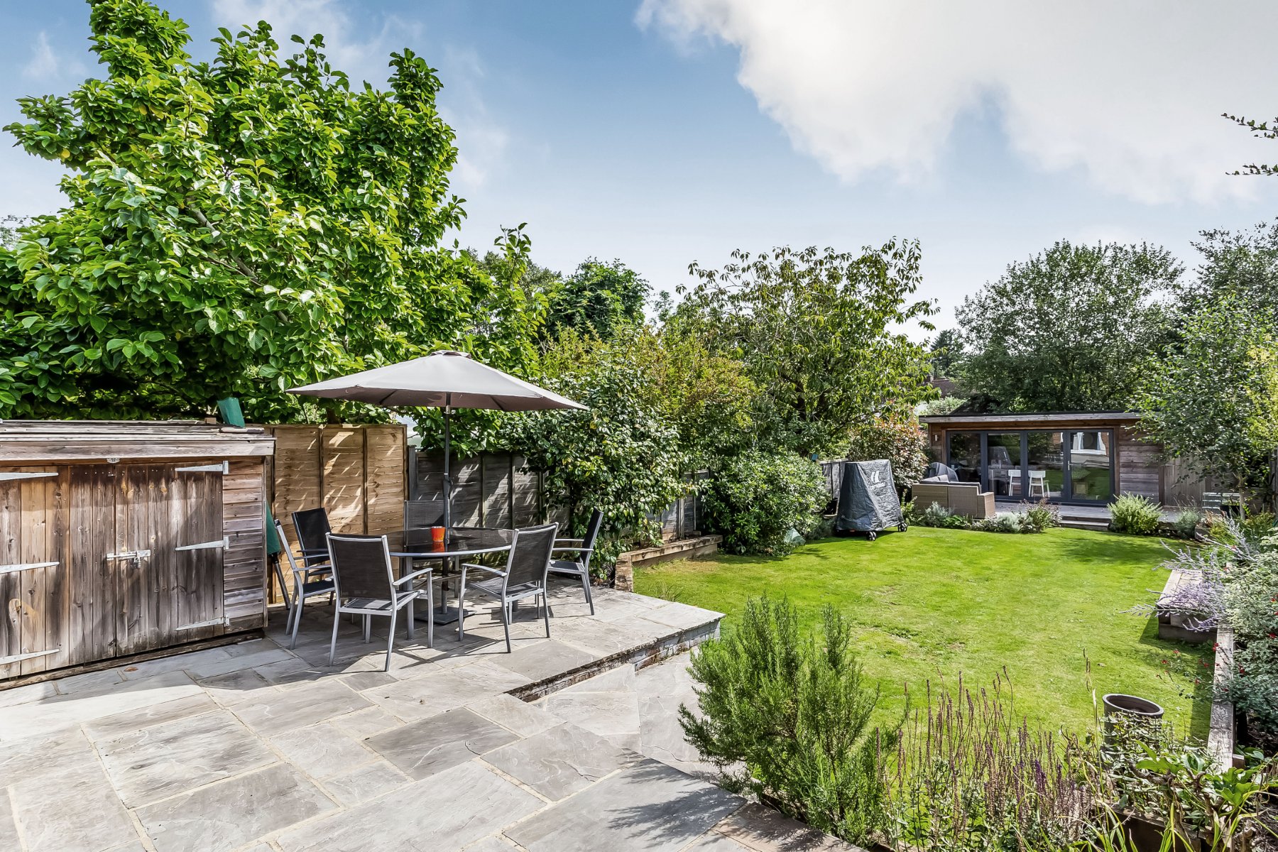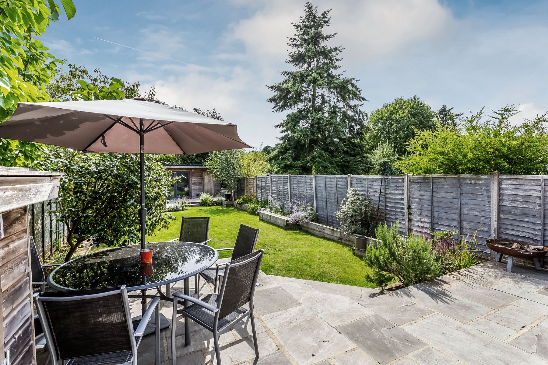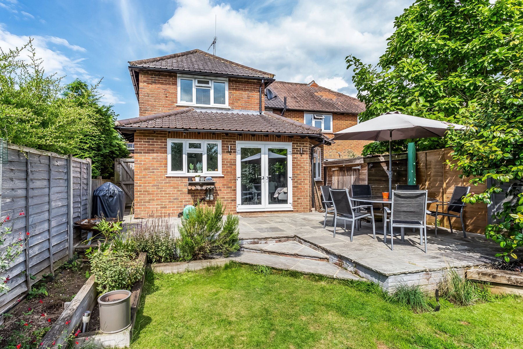 - South-facing gardens with paved and decked terracing and raised flowerbeds