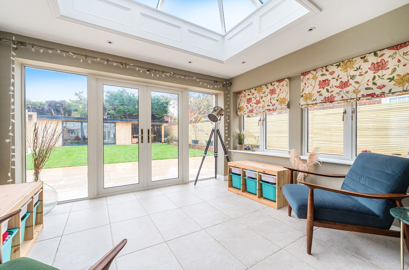With the warming tones of a solid oak floor running underfoot, the ground floor unfolds onto a beautifully considered trio of interconnecting spaces that evoke an enviable sense of style and space. Colour drenched picture rails encompass an impressive sitting room where a wood burner nestles within the fireplace giving a homely glow to the social hub of the house. Brilliantly broad, a wide archway allows garden vistas to be carried through, extending the space into the restful feel of a sunroom. Beneath a roof lantern, it adds a heavenly spot to take a break, start the day with a morning coffee or curl up with a book or podcast. French doors open to make it effortlessly easy for life to filter out onto the landscaped patio, while the sitting room extends to the side into a double aspect study currently used as a formal dining area that's perfect for entertaining.